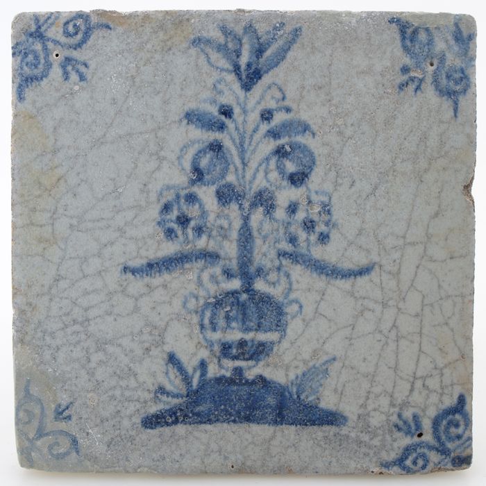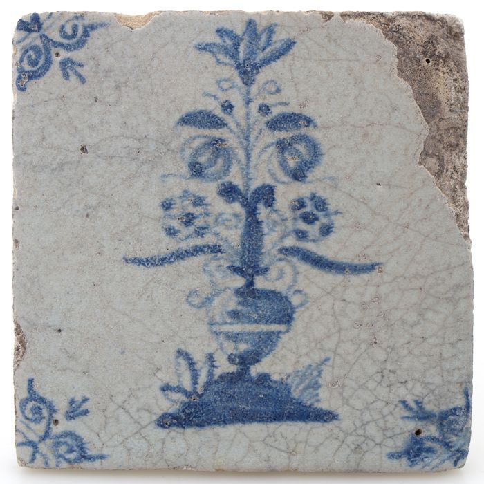 Aardewerk tegel met bloemenvaas en ossenkop hoekmoti...