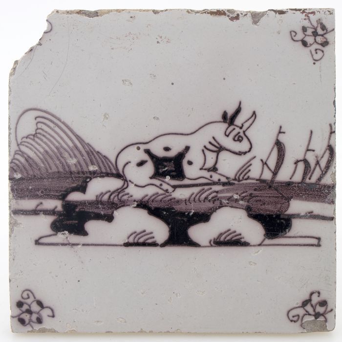 Aardewerk tegel met landschap en koe, paars op wit, ...