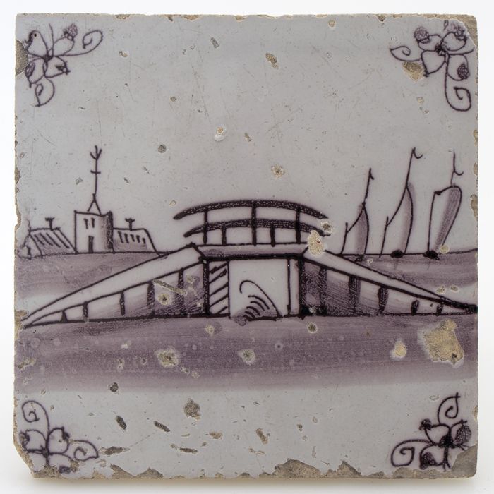 Aardewerk tegel met molen, paars op wit, hoekmotief ...
