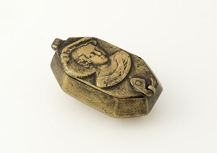 Koperen tabaksdoos met reliëfportret Willem III als ...