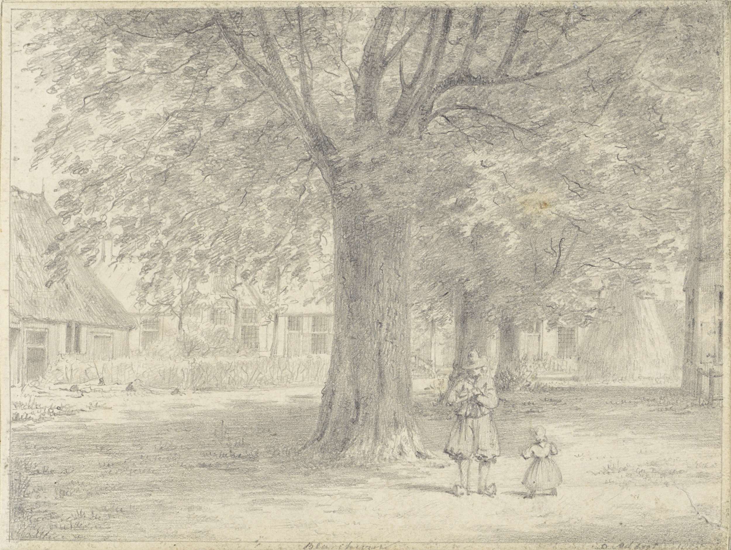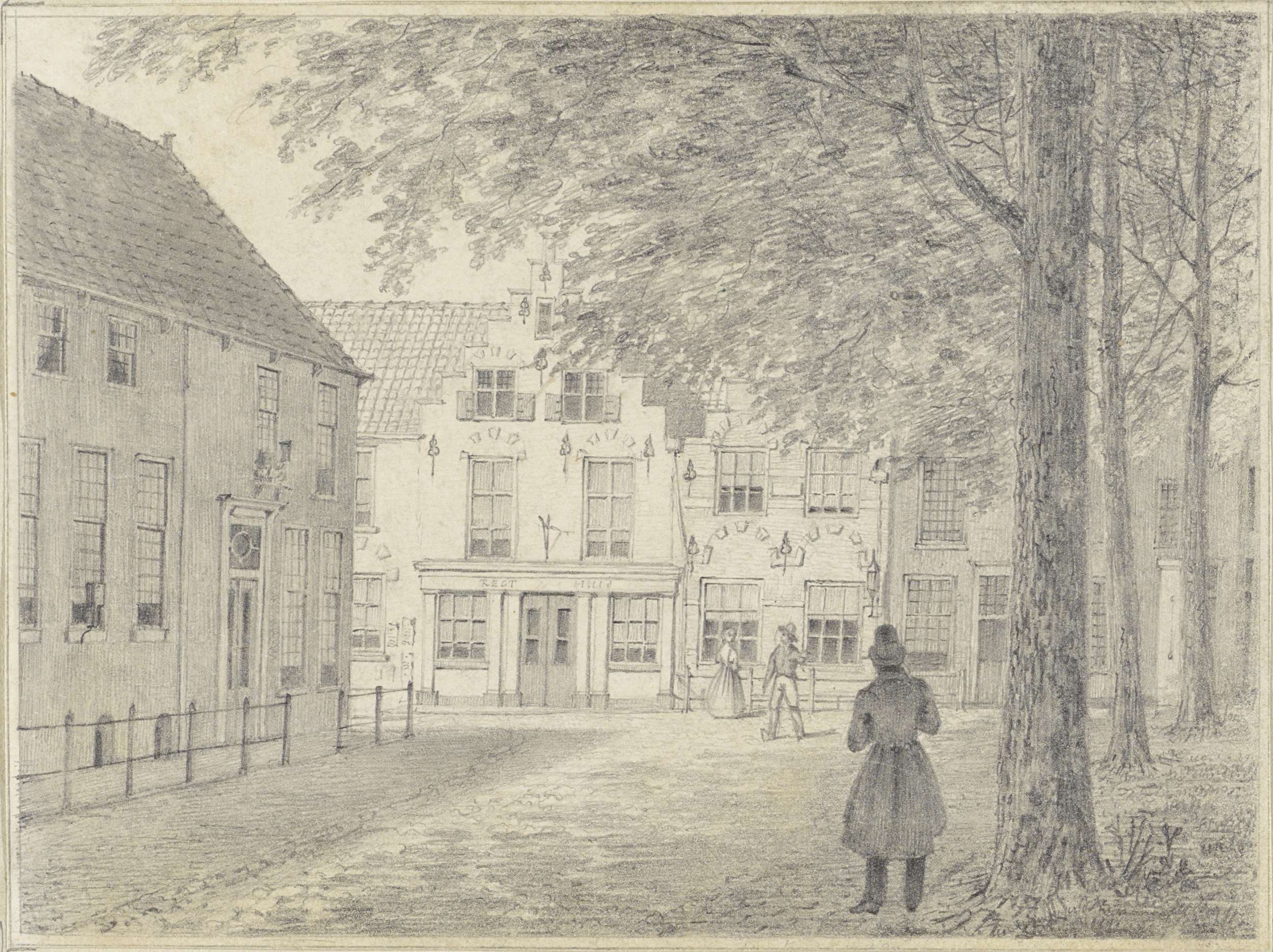 Dorpsgezicht met links twee mannen leunend tegen een...