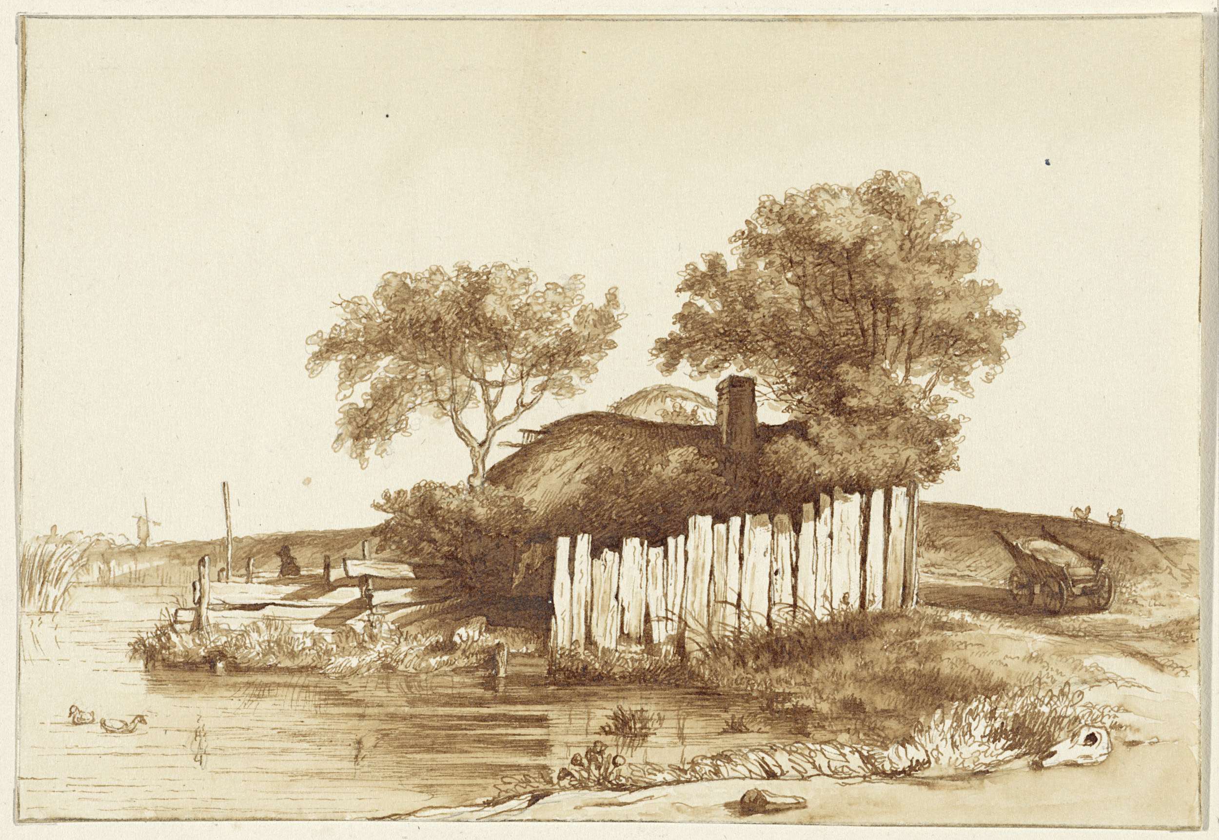 Huisje met omheind erf aan het water