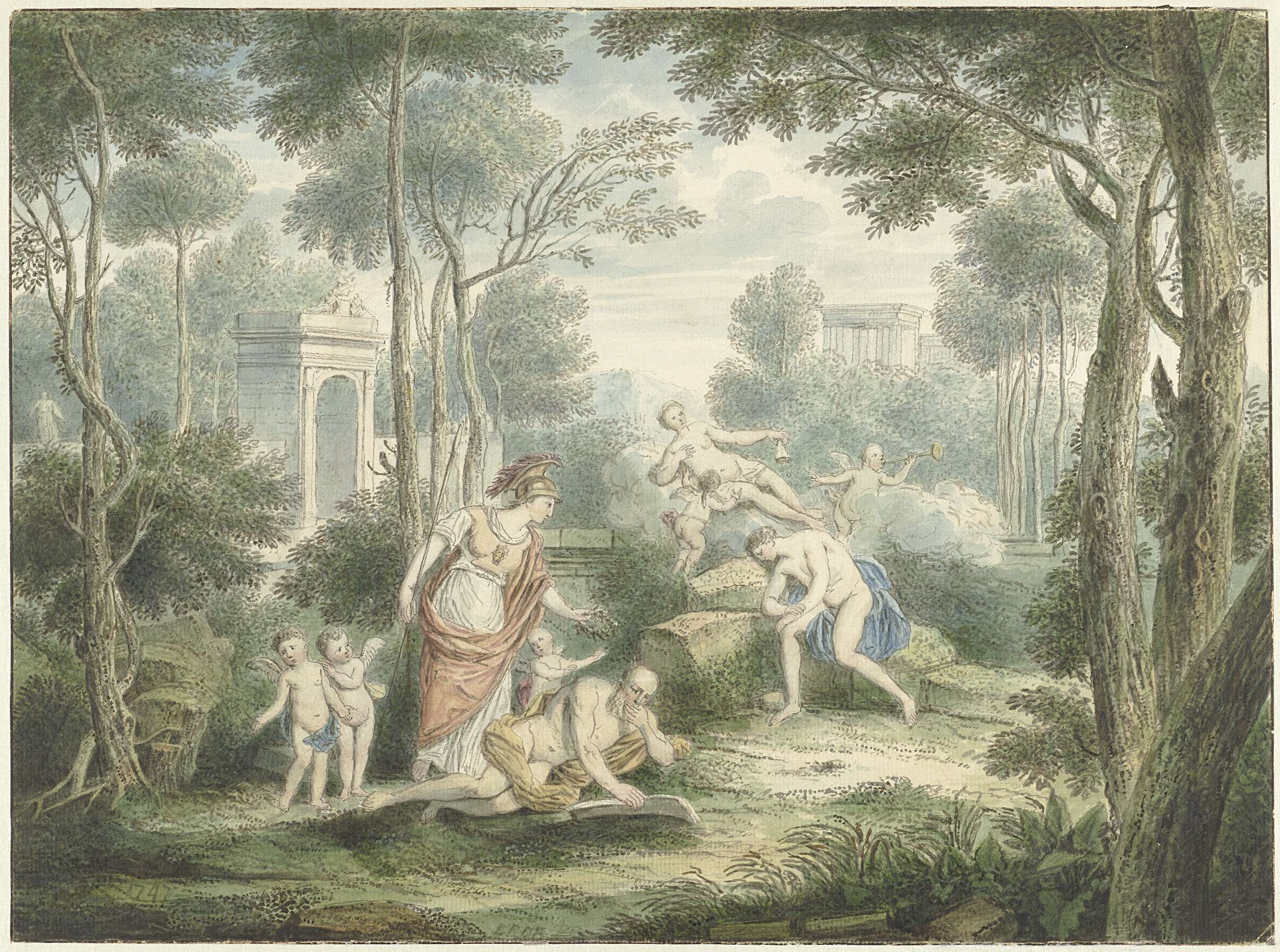 Arcadisch landschap met Athene die een oude man kroo...