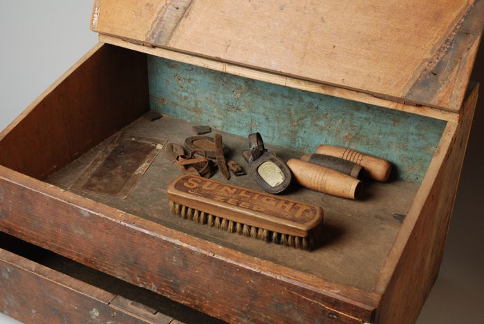 Houten lessenaar waarin gereedschappen, met hellende...