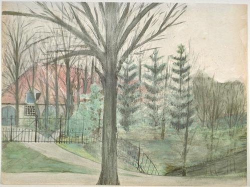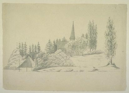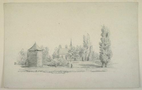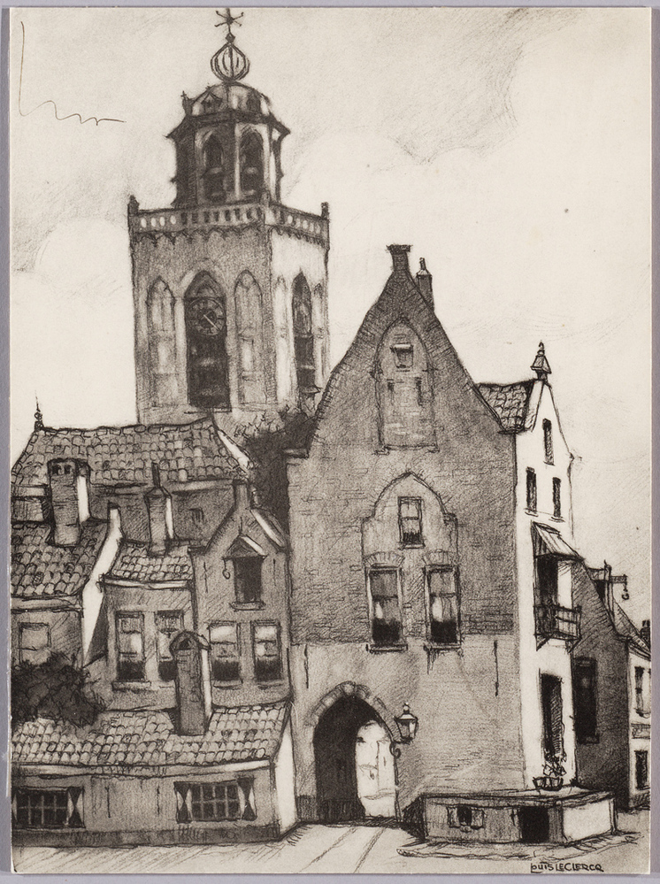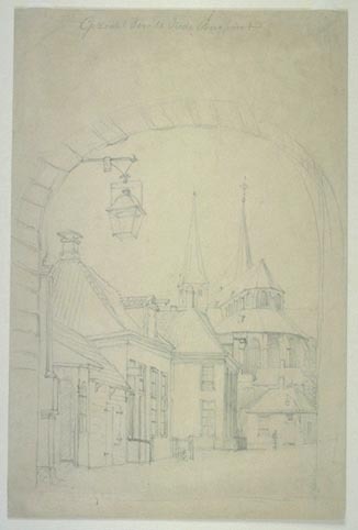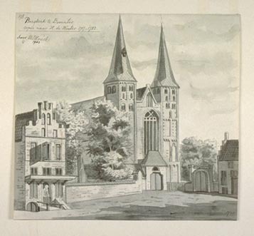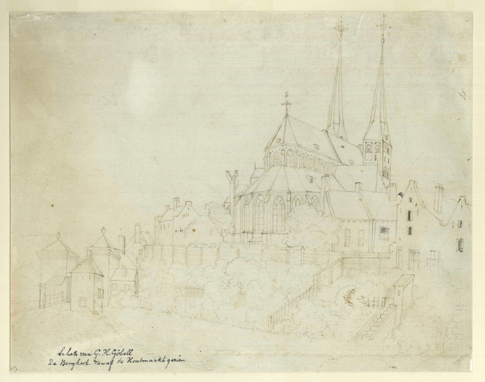 Zijaanzicht van de Bergkerk met op de voorgrond de t...