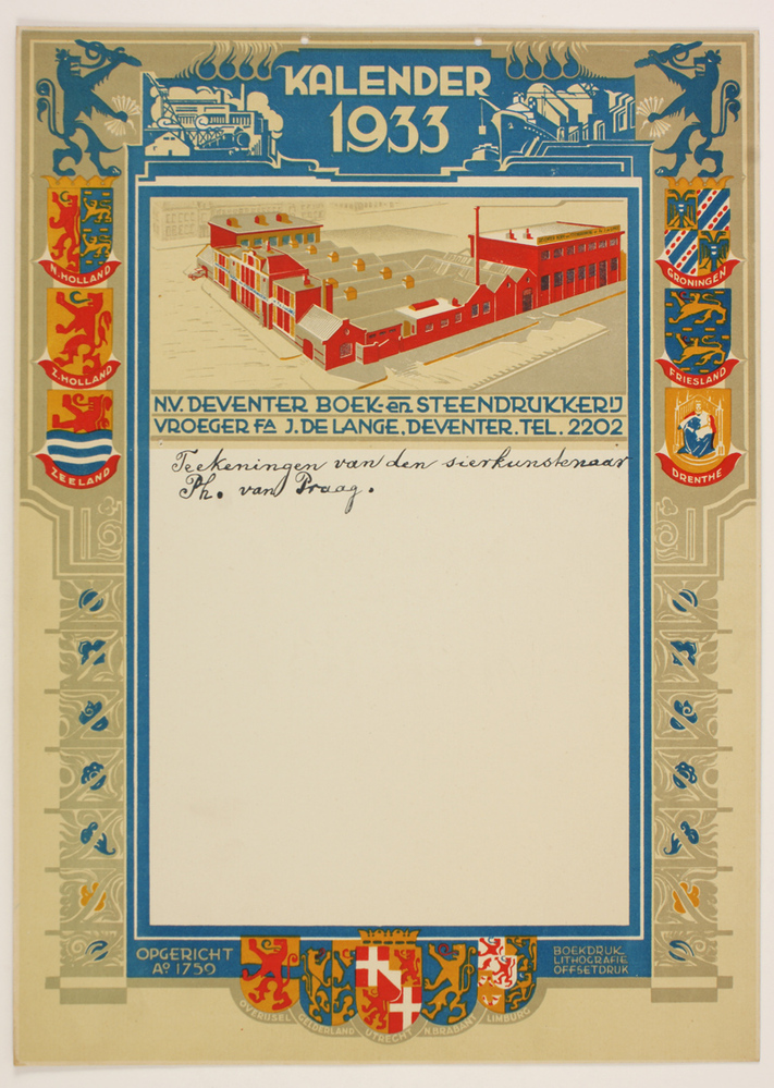 Voorzijde kalender 1933 met afbeelding van fabriek