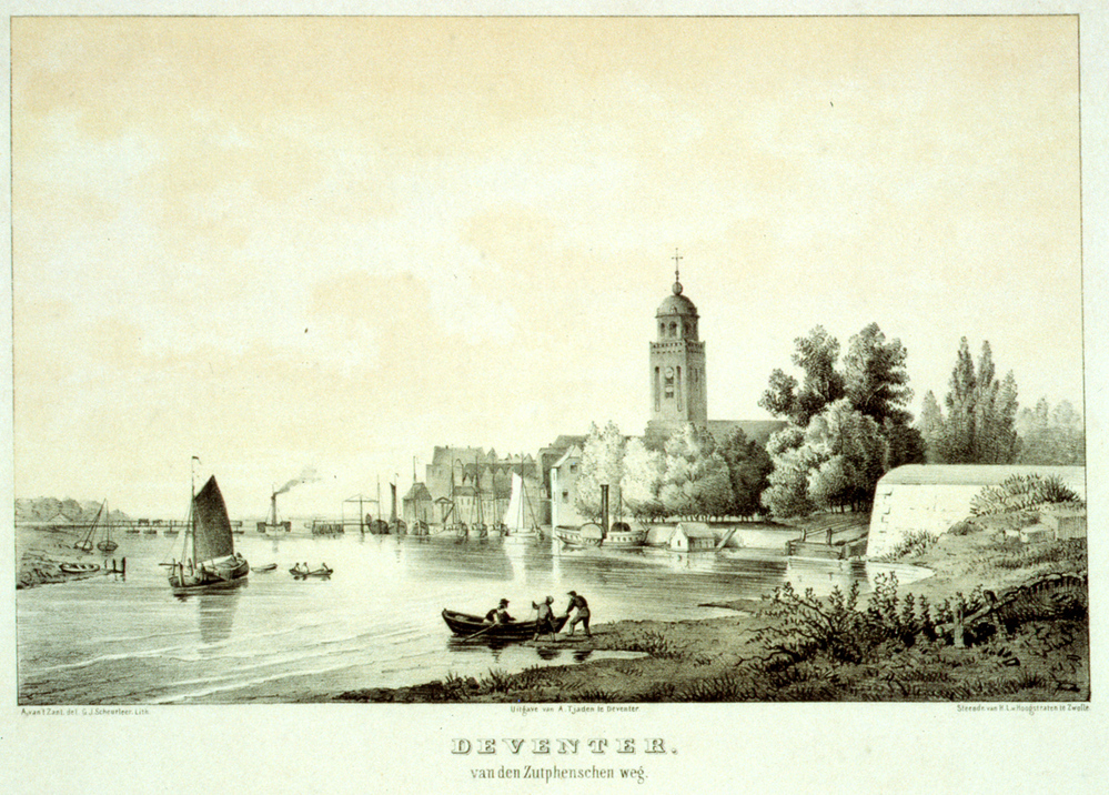 Deventer, Gezicht op Grote Kerk (3x) en IJssel met o...