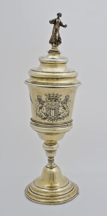 Verguld zilveren beker met verschillende wapens (Sch...