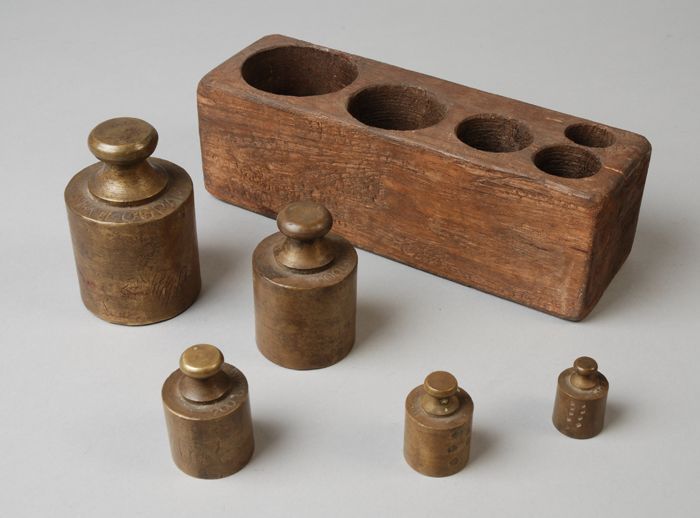 Houten gewichtenblok met vijf koperen gewichten