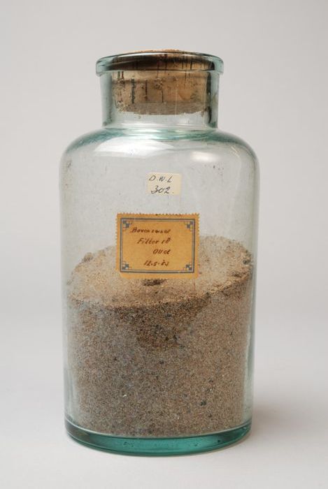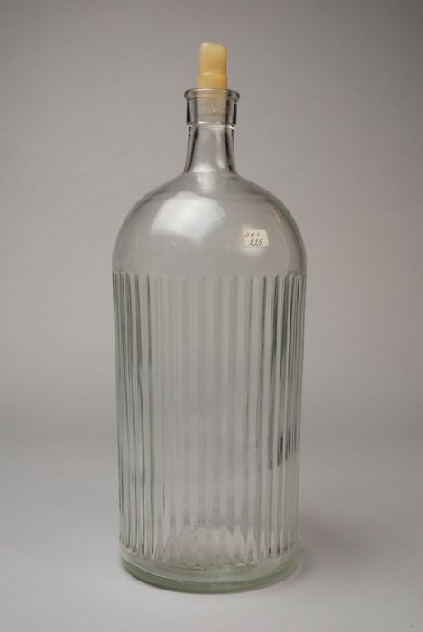 Glazen fles met kurken stop, inhoud en label: "Boven...