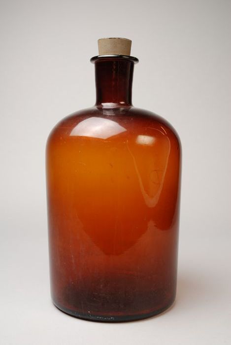 Bruine, glazen fles met rubber stop en opschrift: "D"