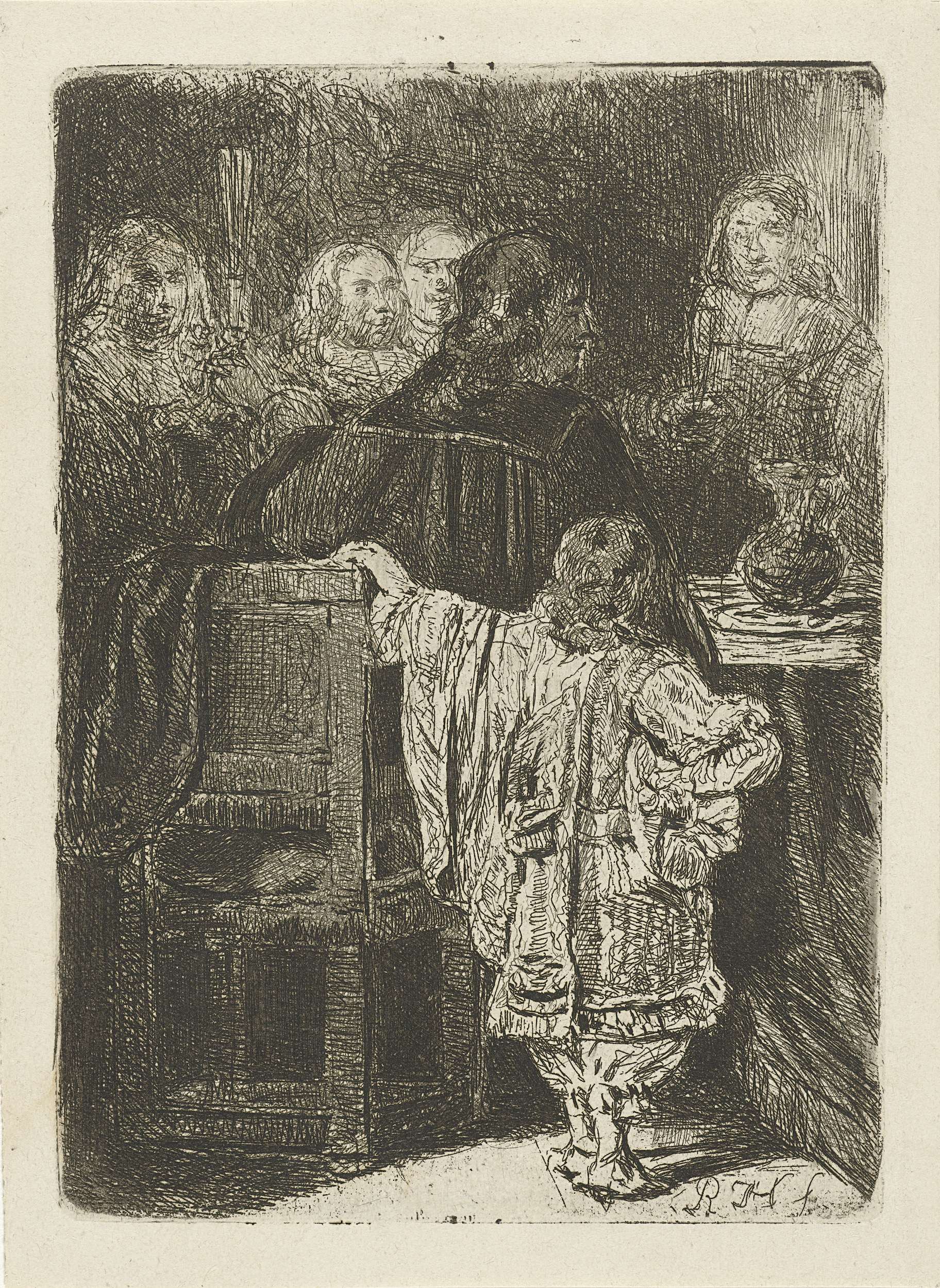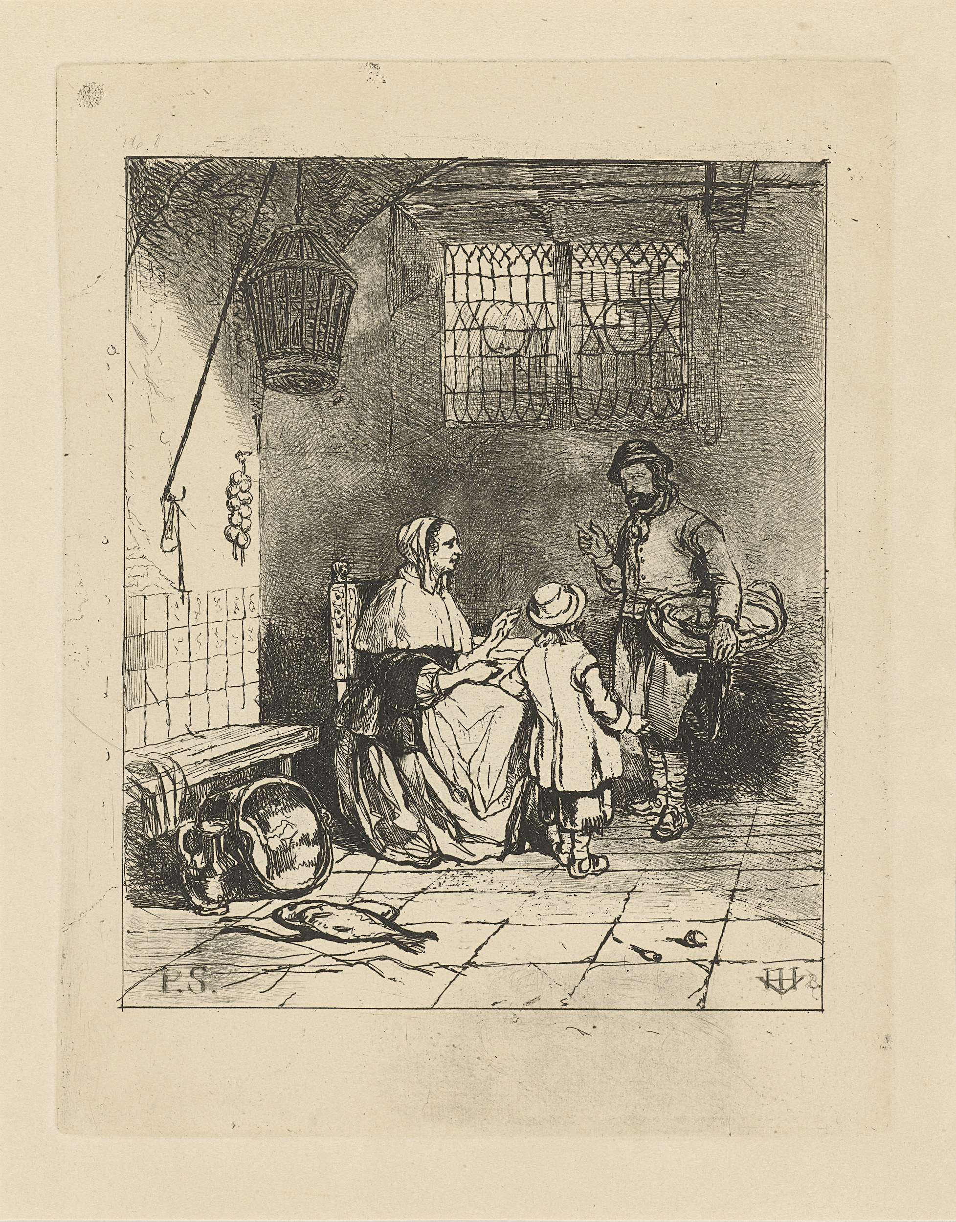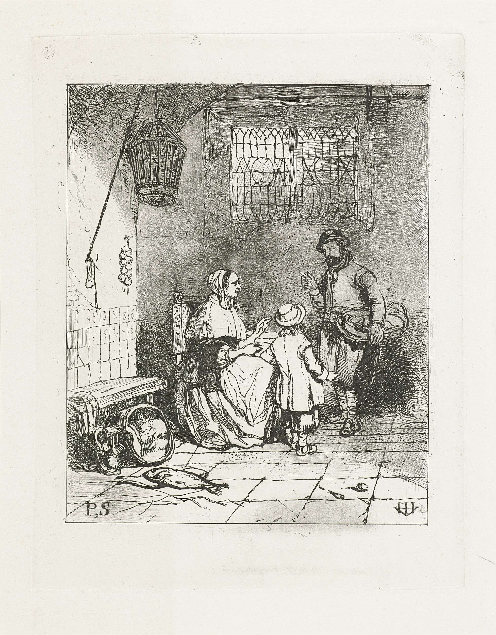Drie figuren in een keukeninterieur