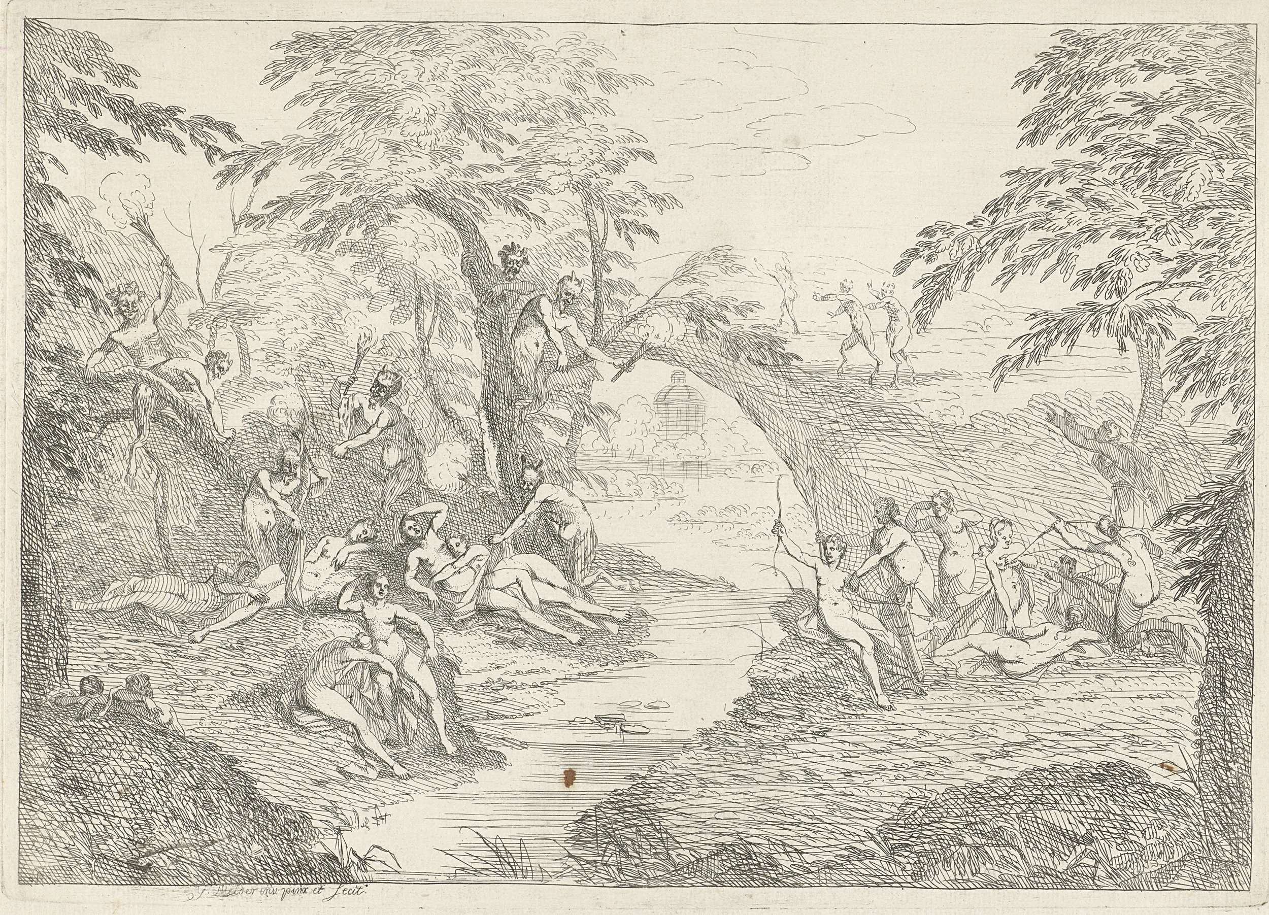 Nimfen en saters bij een beek