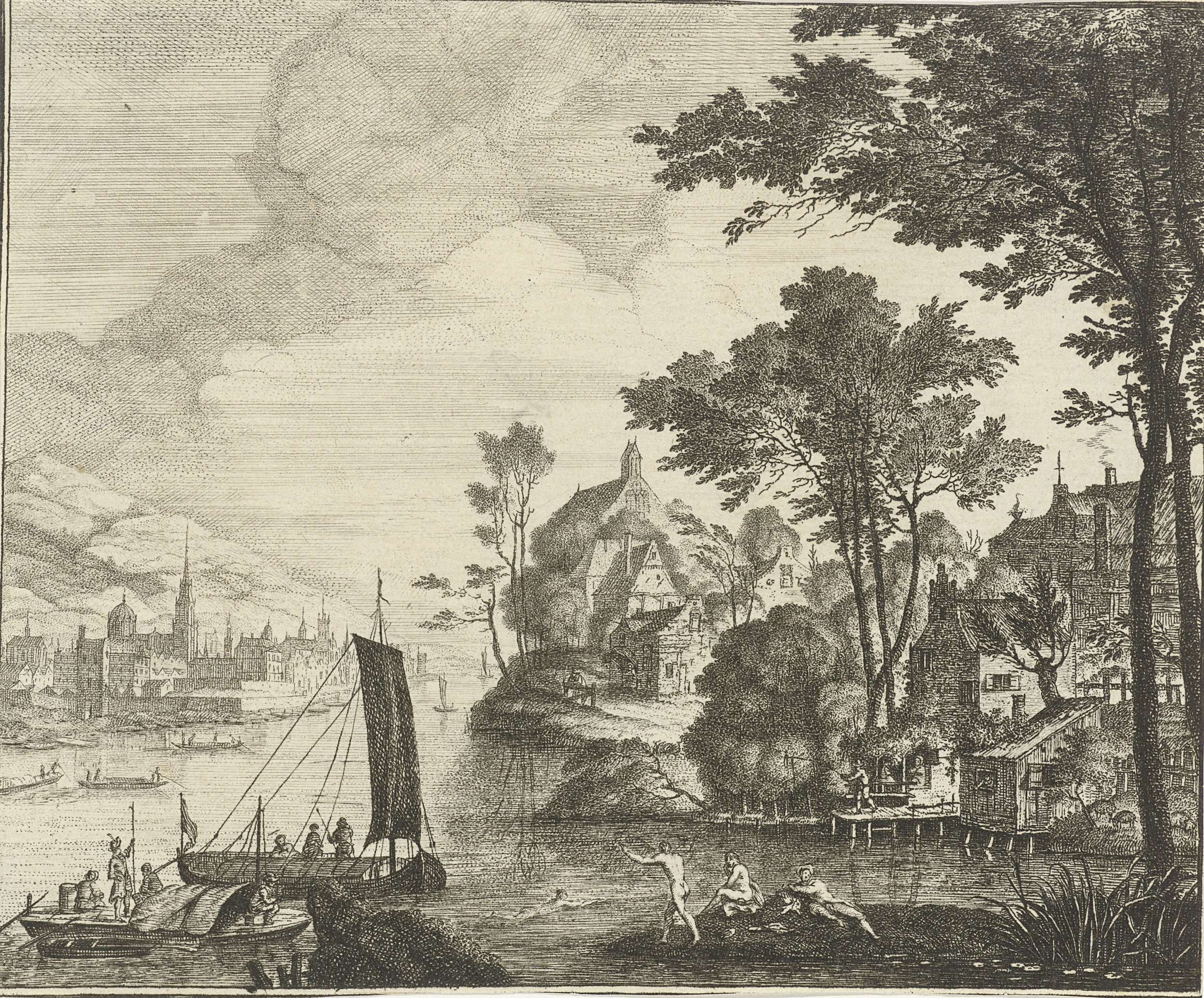 Landschap met baders en hengelaars