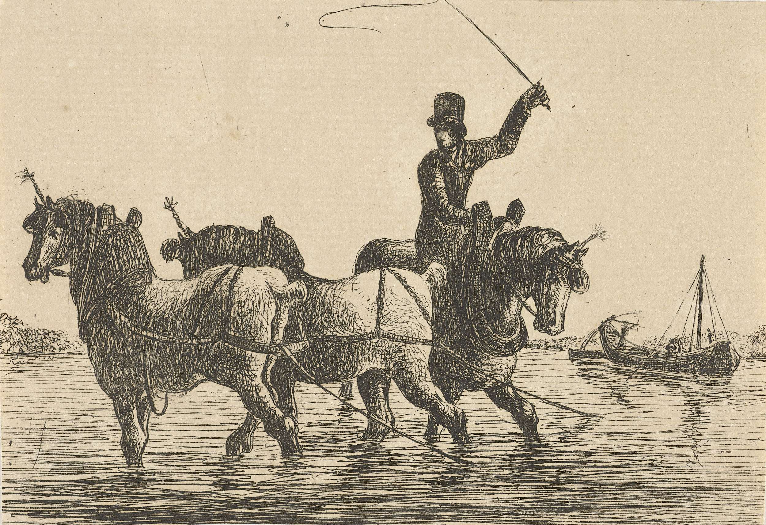 Drie trekpaarden in het water