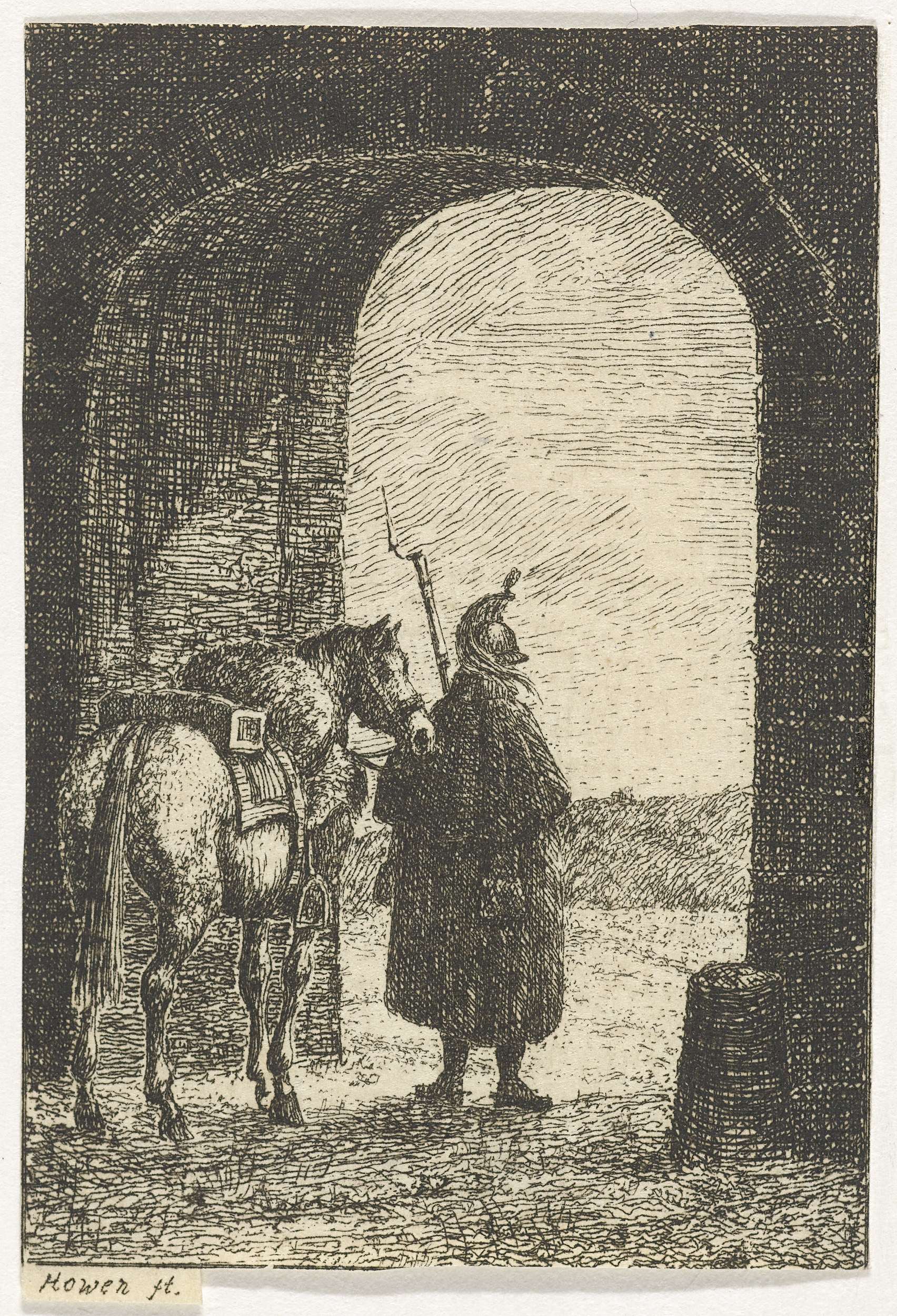 Soldaat met paard in een poort