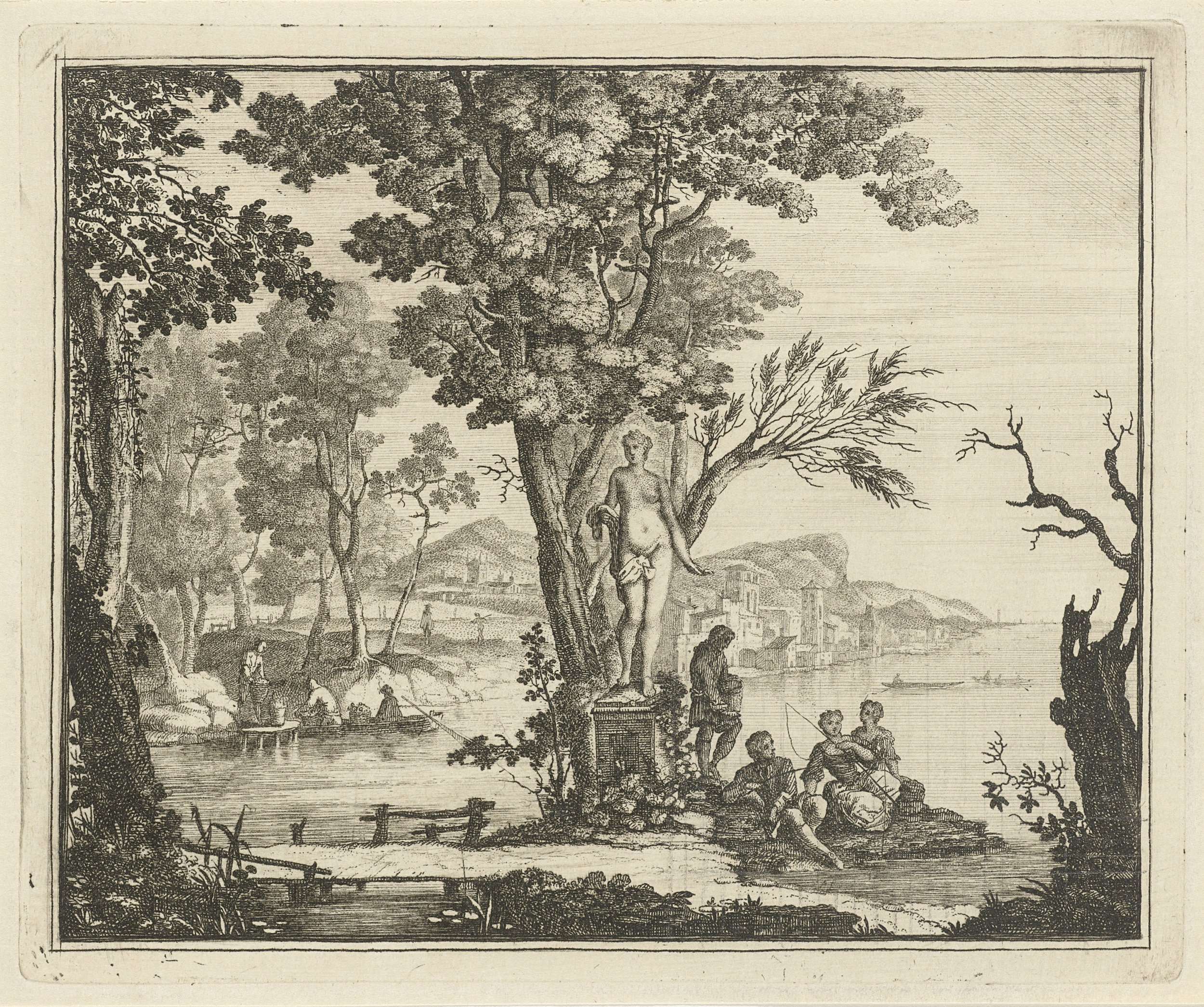 Rivierlandschap met hengelaars bij een beeld van Venus