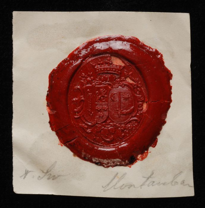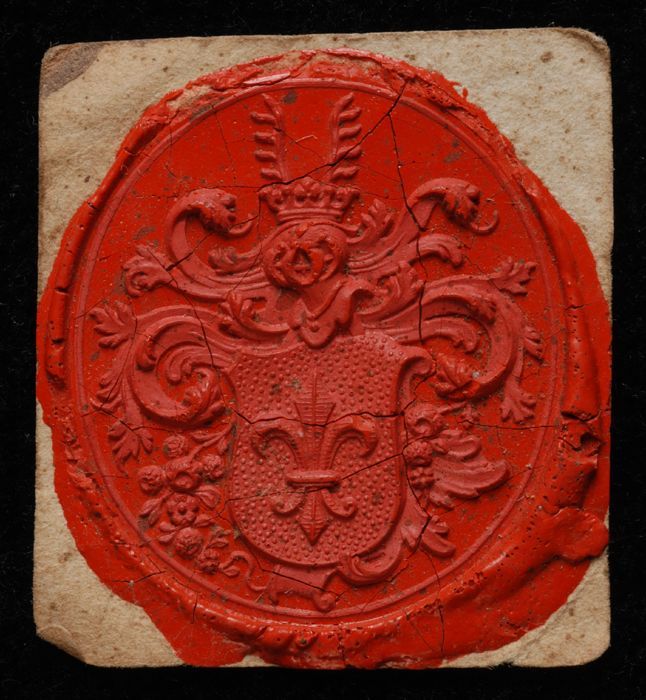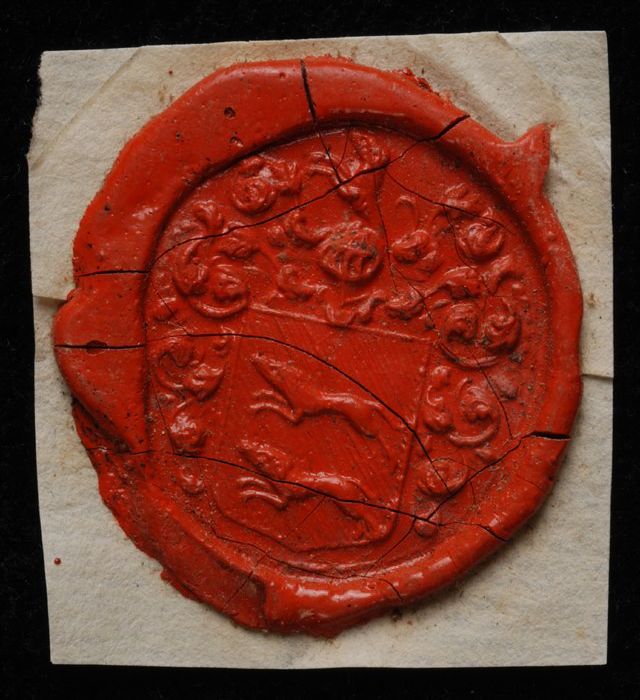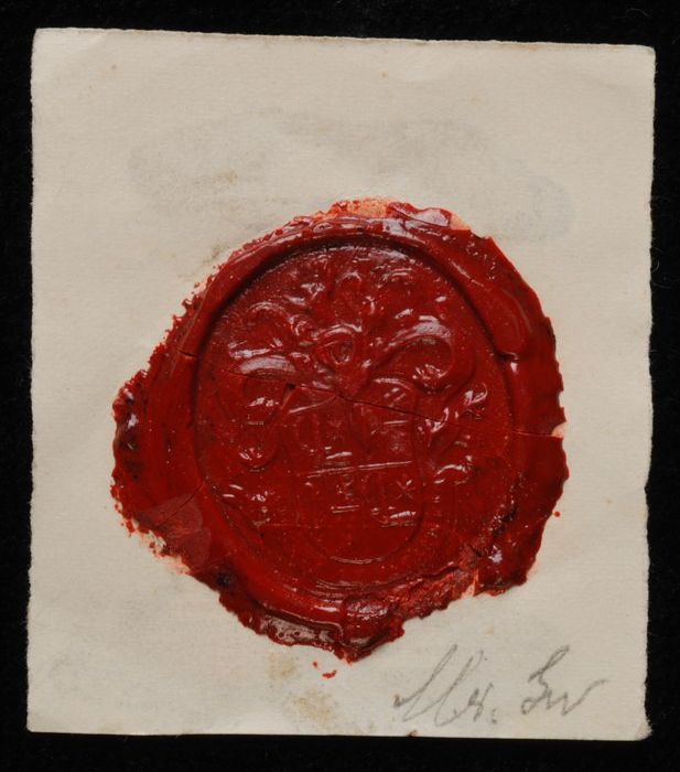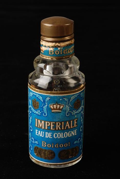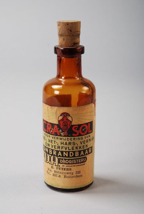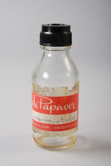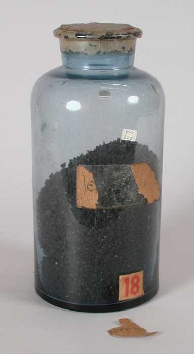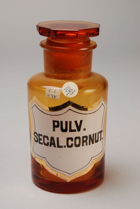 Bruine, glazen fles met stop en label: "Pulv. Secal....