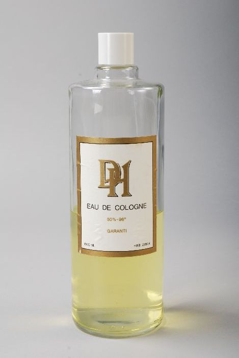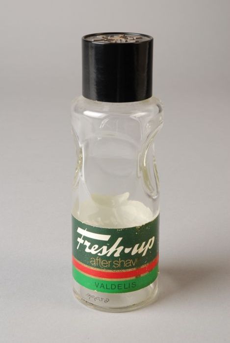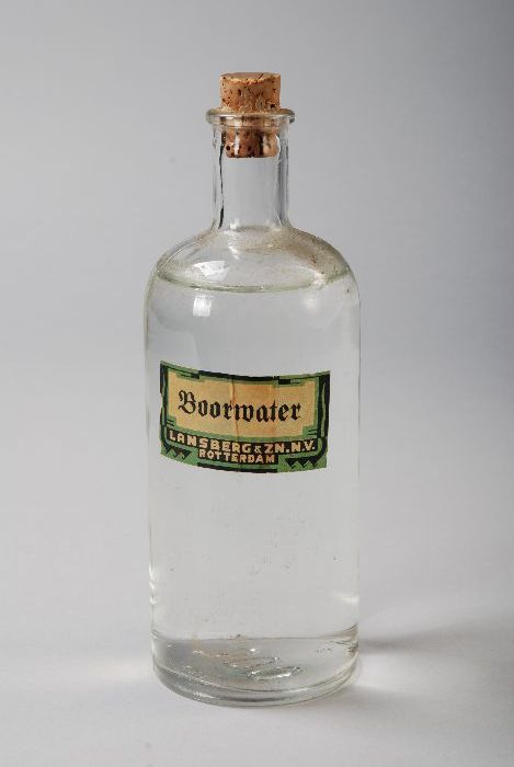 Lichtblauwe, glazen stopfles met kurk, inhoud en een...