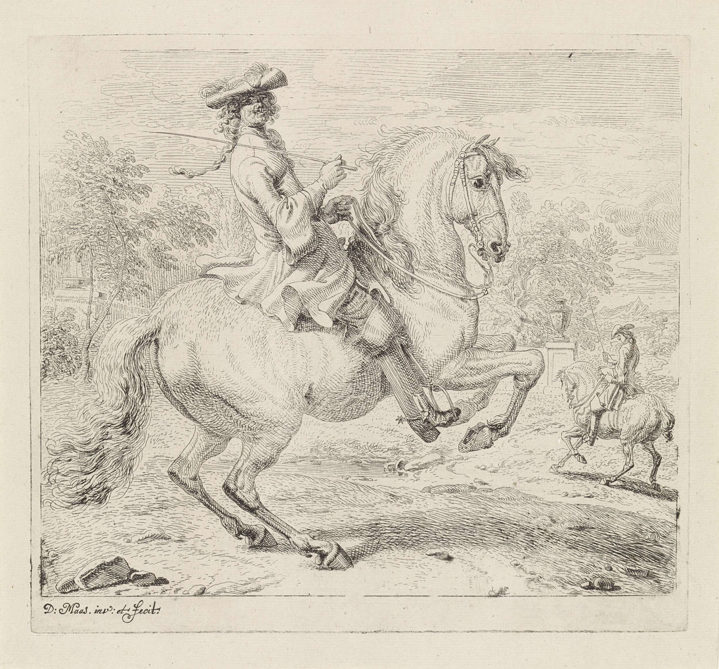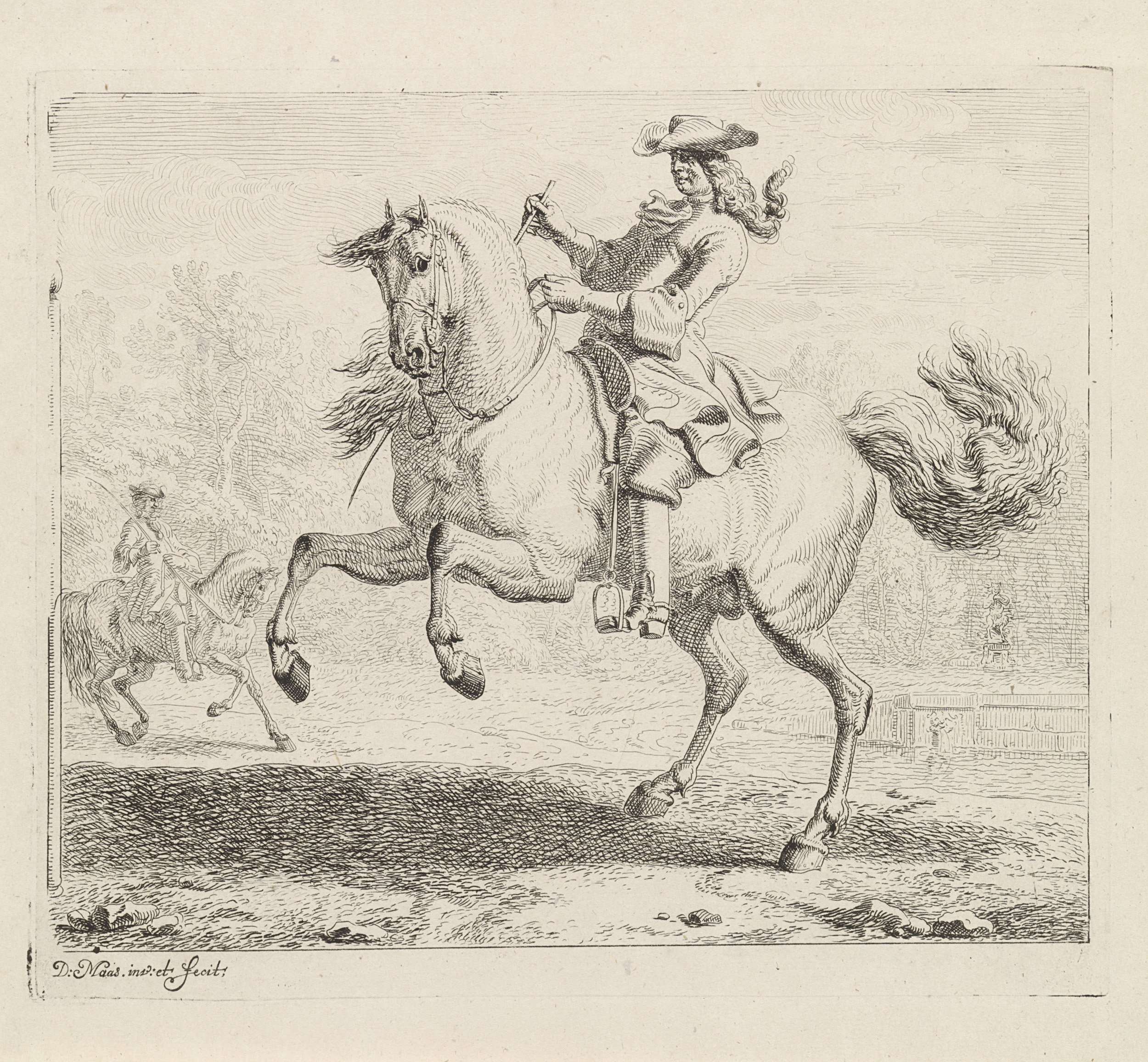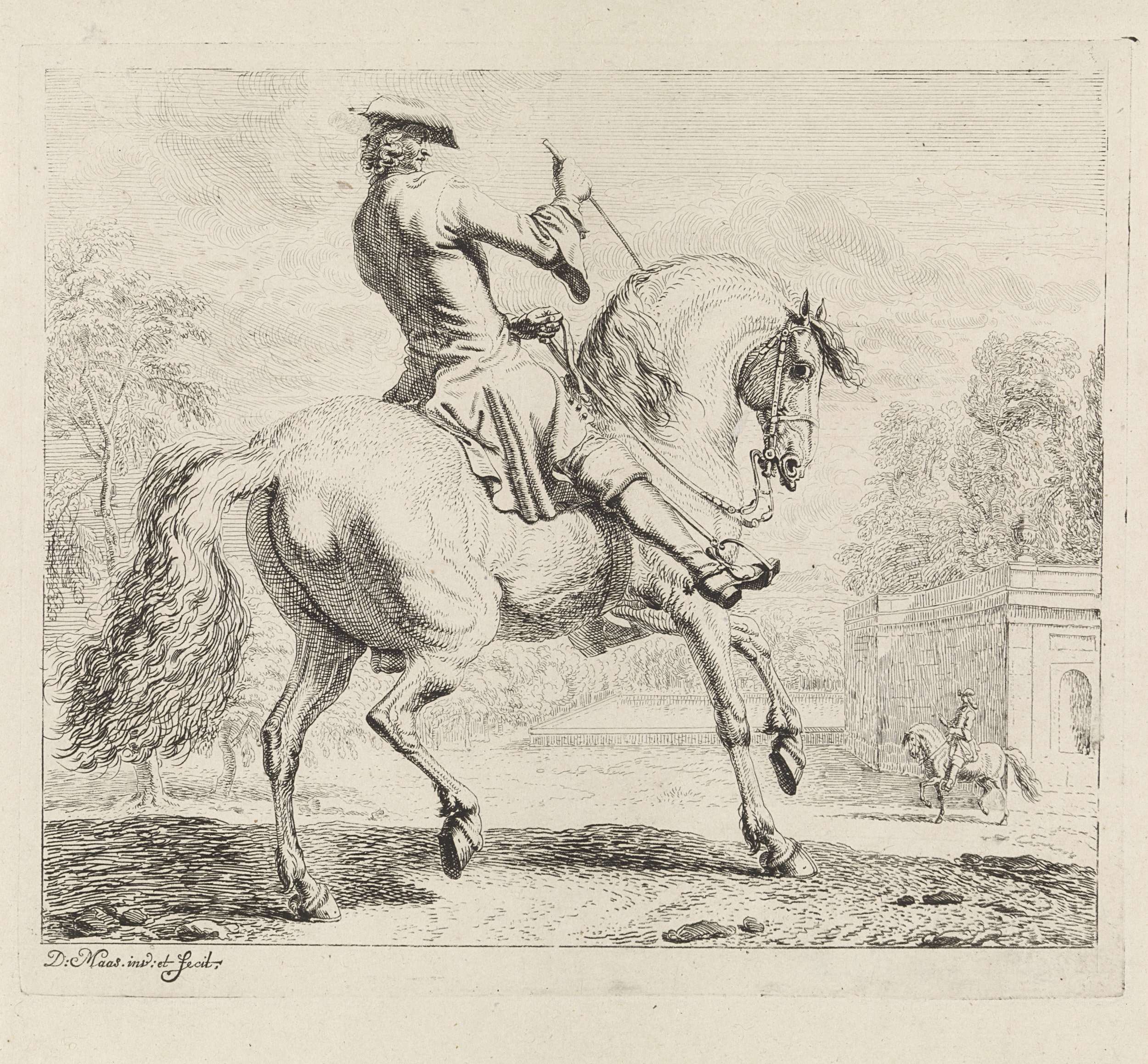 Ruiter met steigerend paar naar links bij een aquaduct