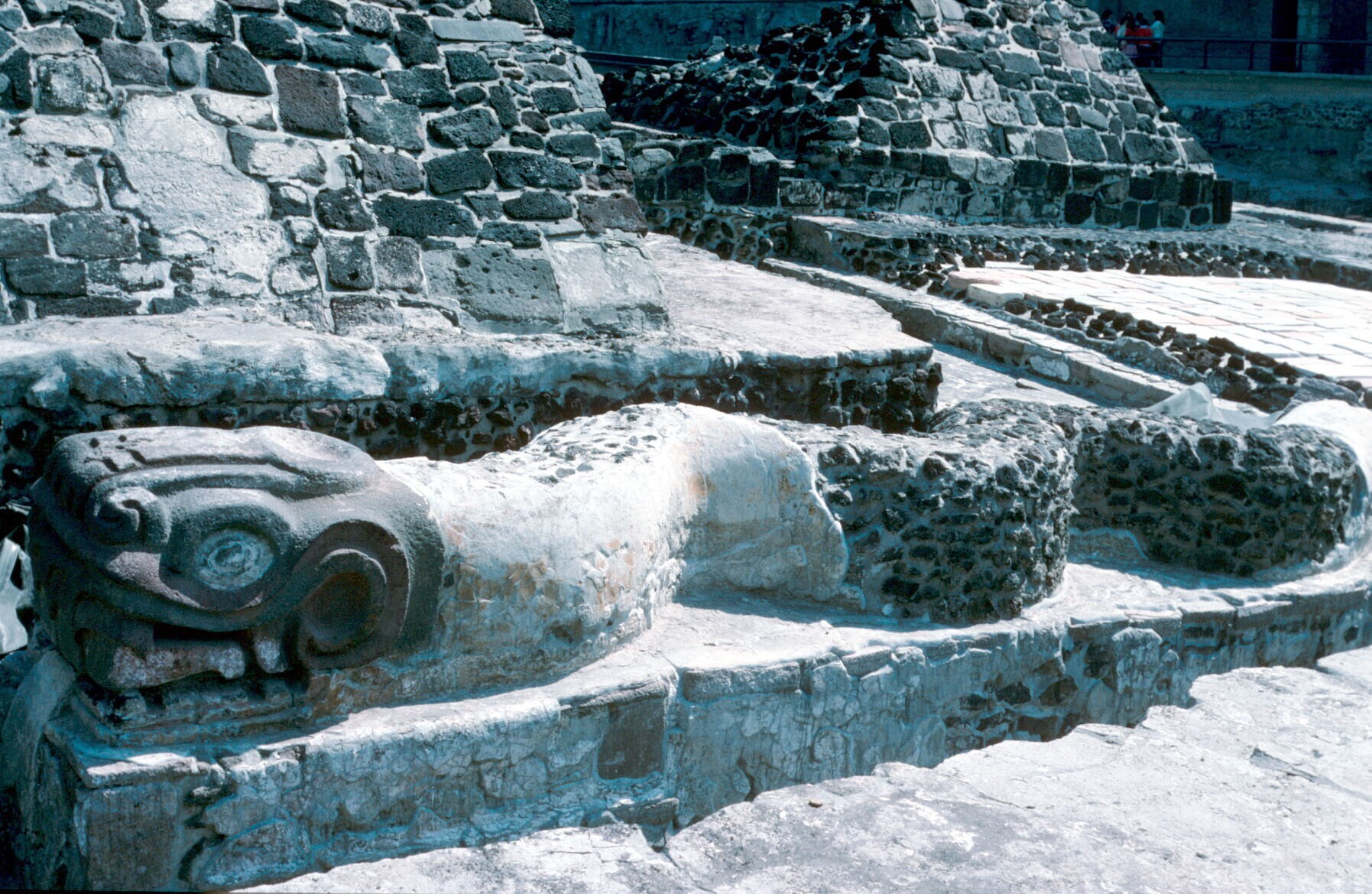 stenen slangensculptuur bij opgraving Templo Mayor