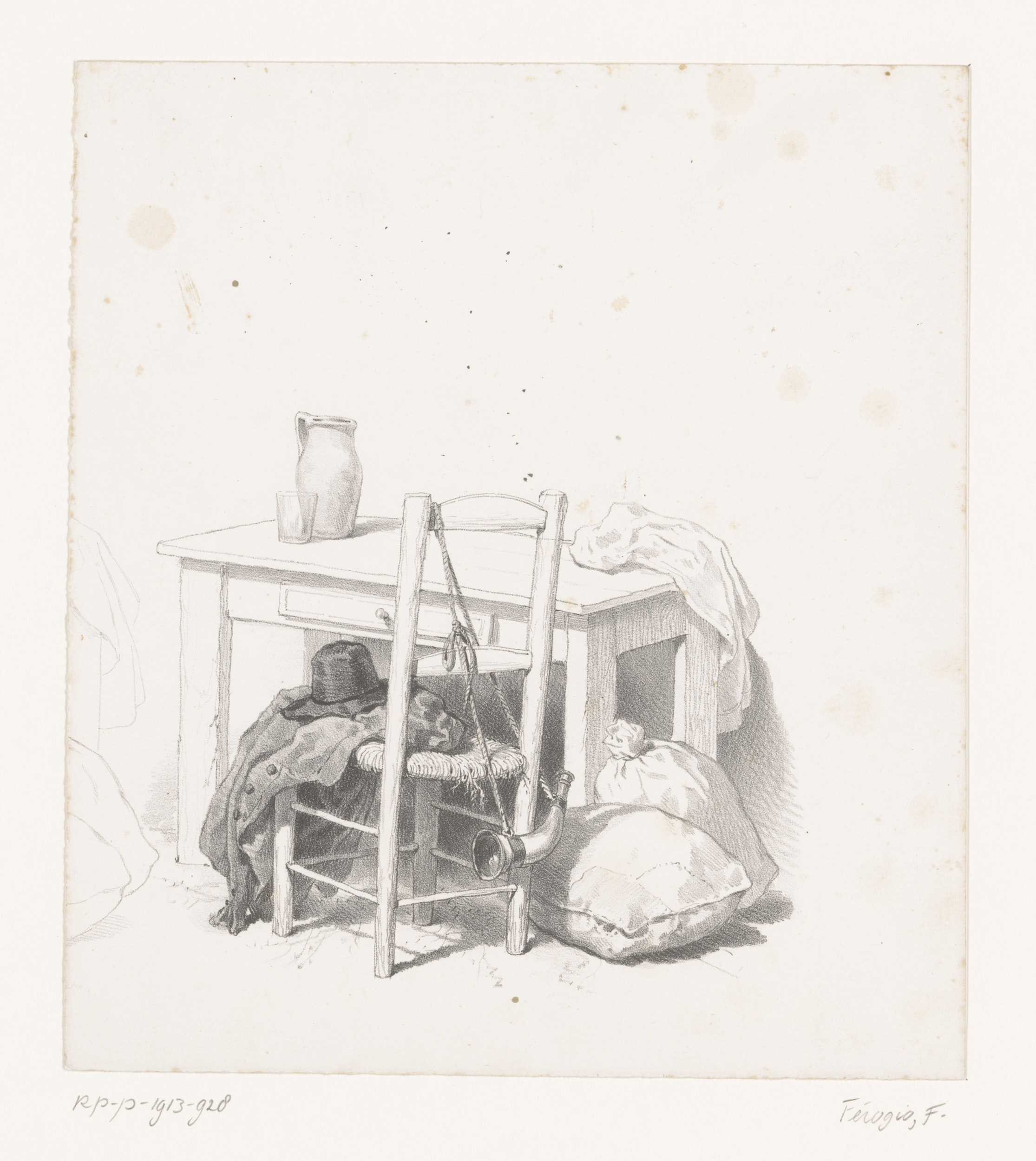 Tafel en stoel met voorwerpen van een jager