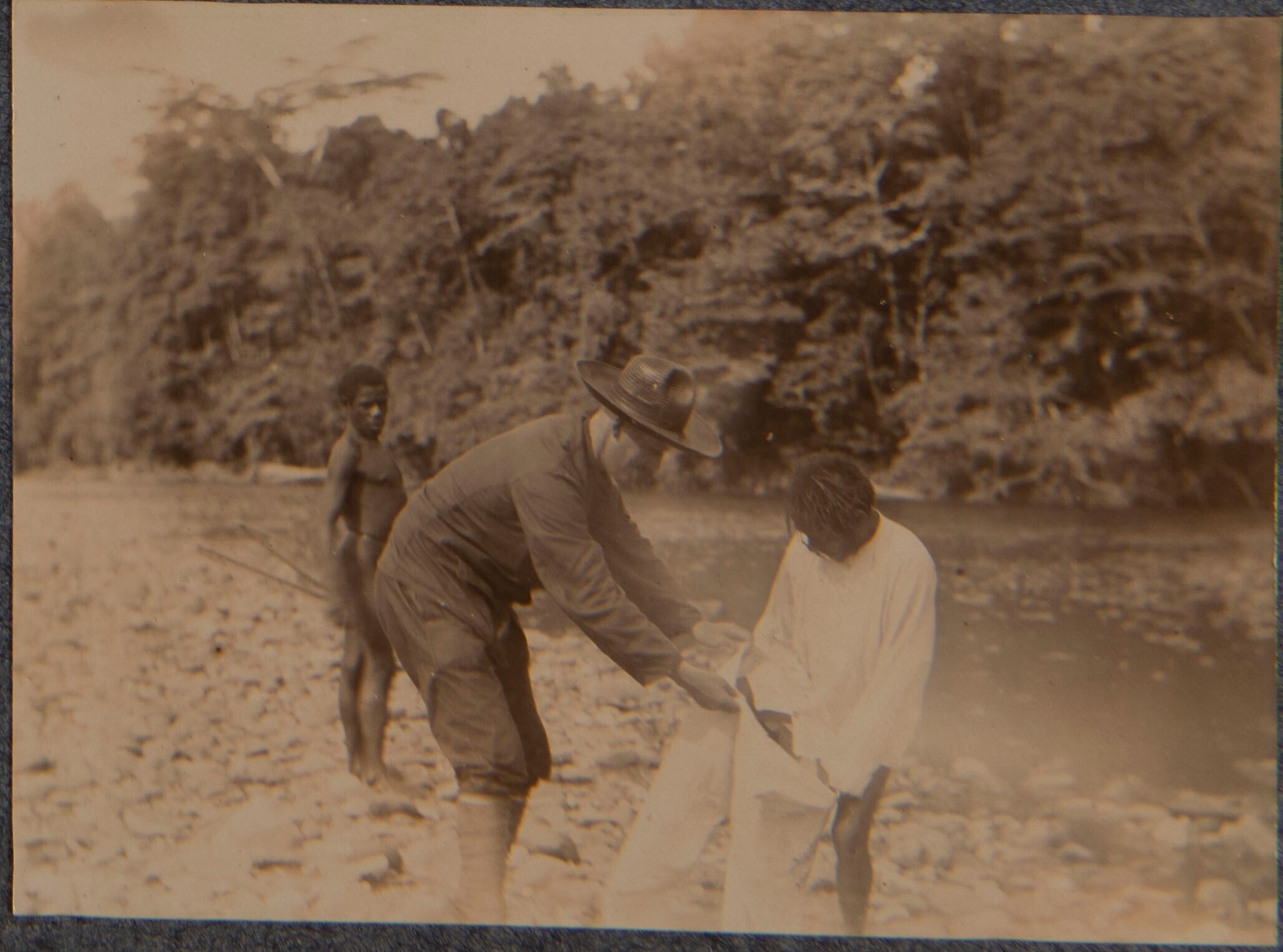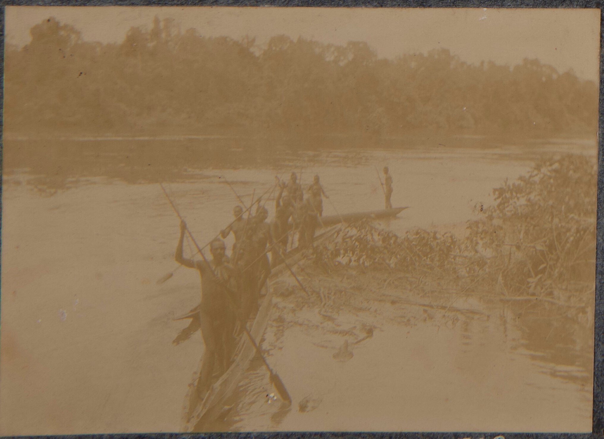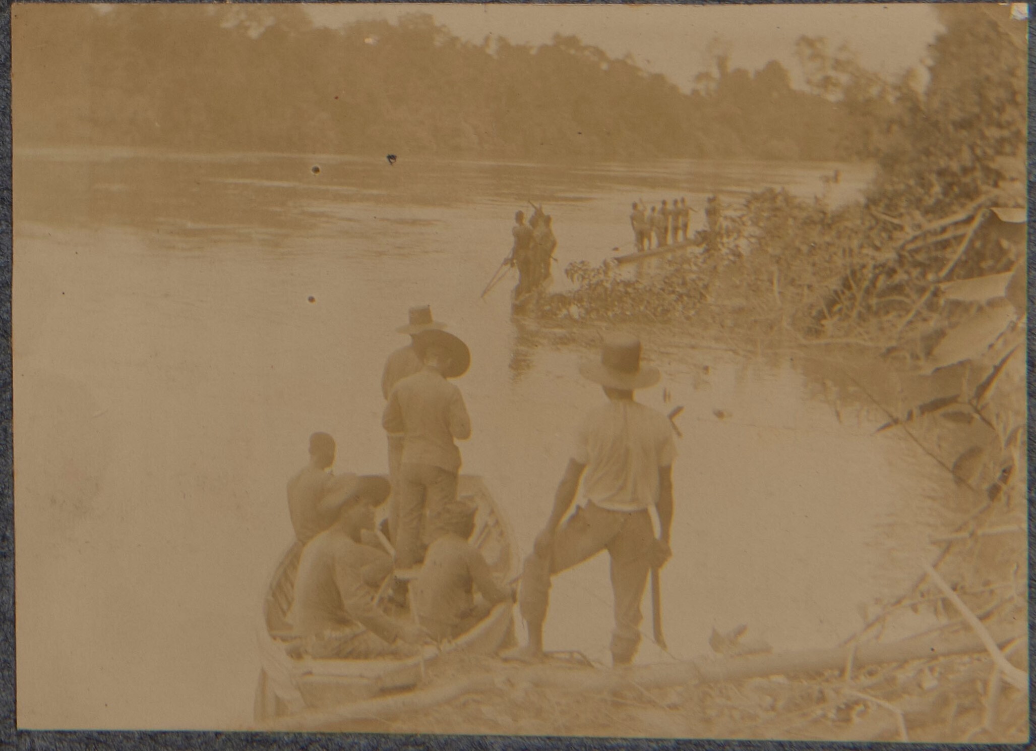 Leden van de legerexpeditie in een boot, verder op d...
