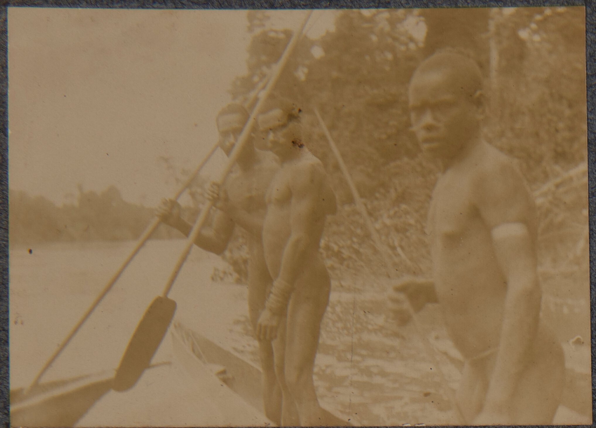 Drie papuamannen in een prauw op de Eilandenrivier n...