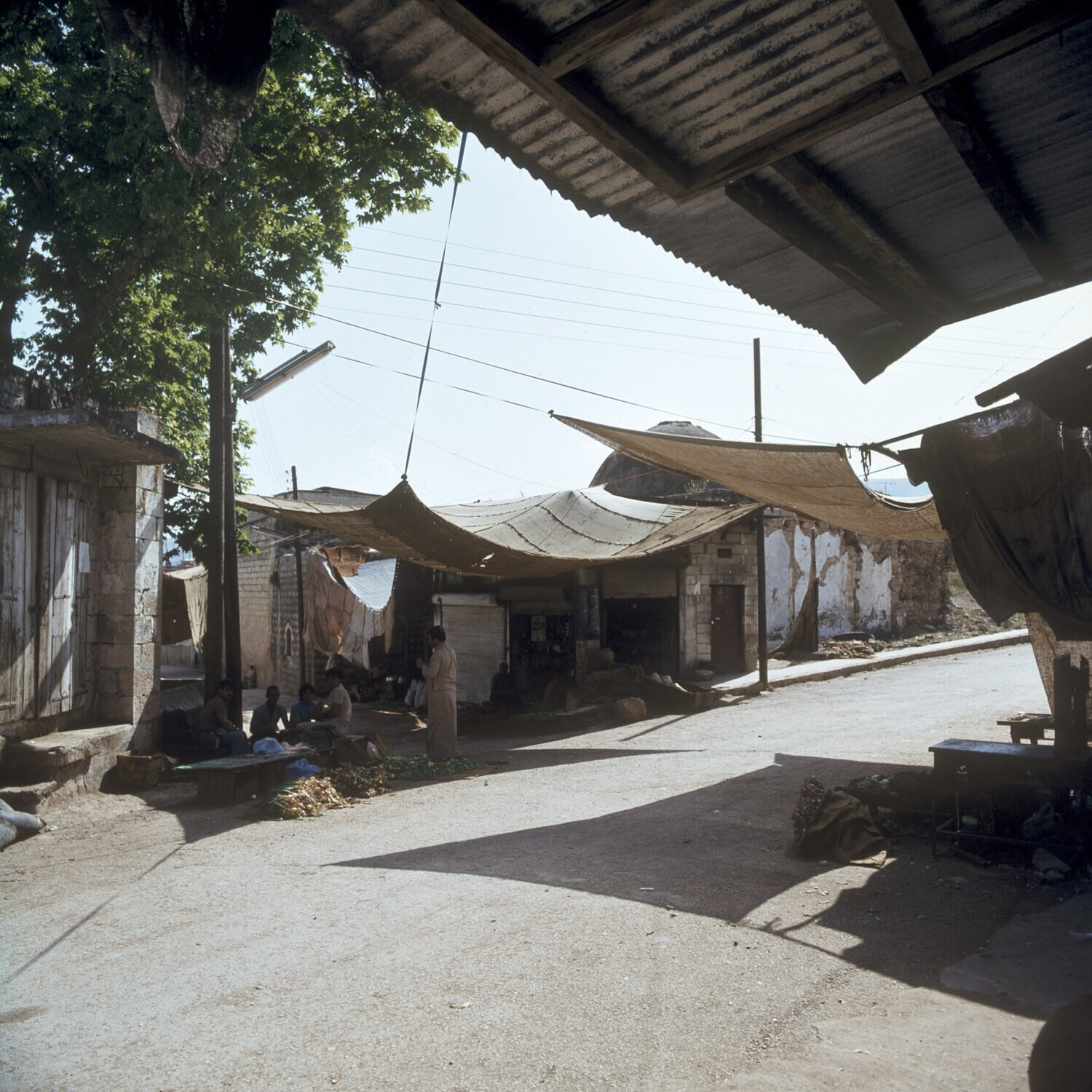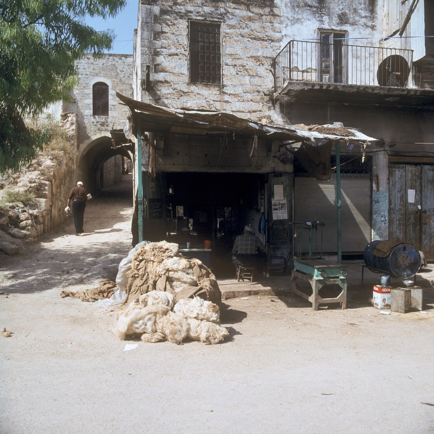 Street view including wool drying in the sun