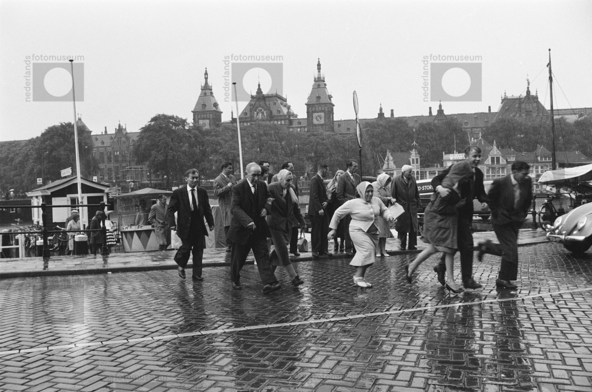 Amsterdam. Regen. Toeristen steken de straat over op...