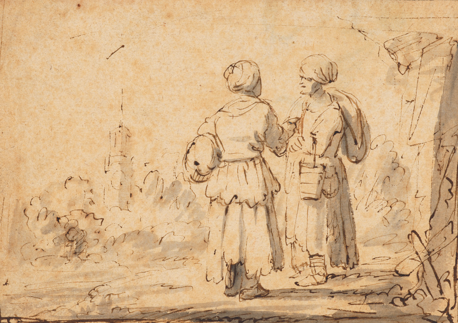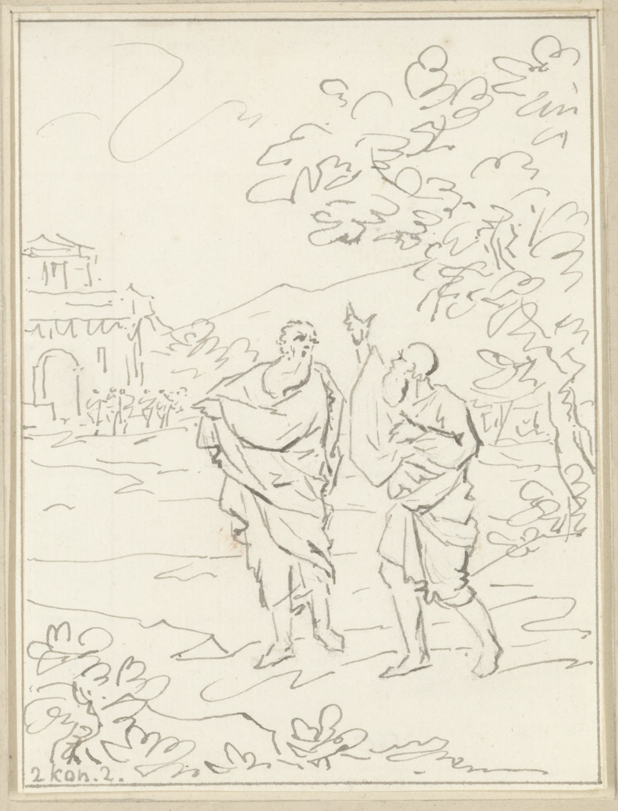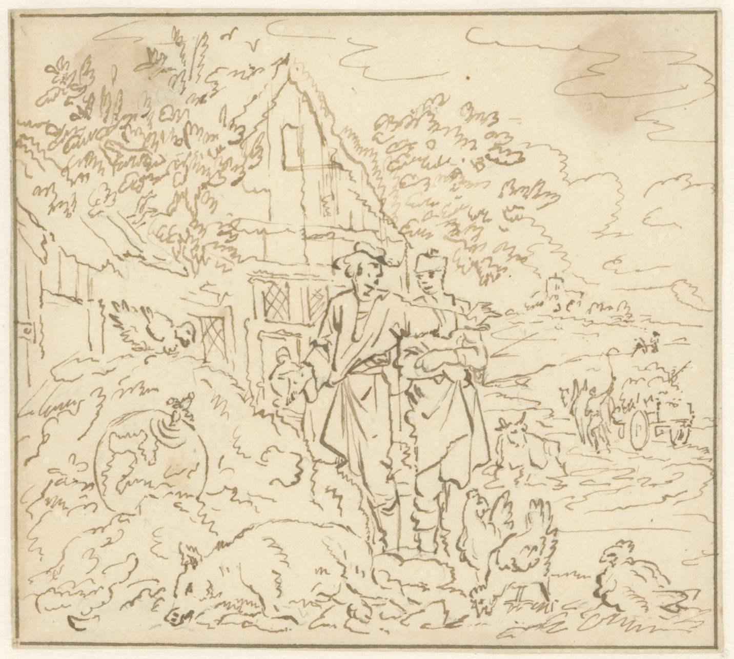 Twee vrouwen in gesprek (Recto). Restant van een kos...