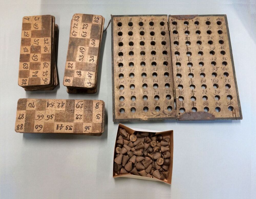 Budde met kienspel en een doosje met vierkante stukj...