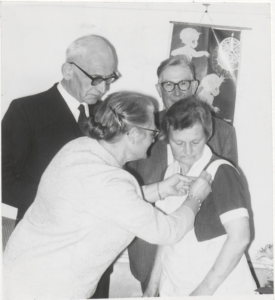 Vrouw in zorguniform wordt onderscheiden, twee manne...