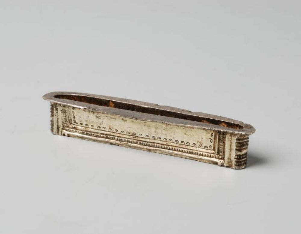 Zwaardschedebeslag van zilver met runeninscriptie ui...