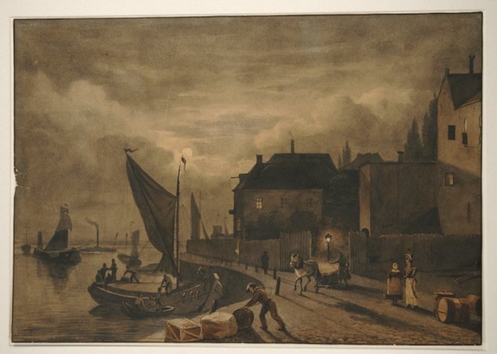 Lossen van een schip aan de kade bij de Veerpoort bi...