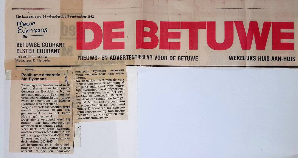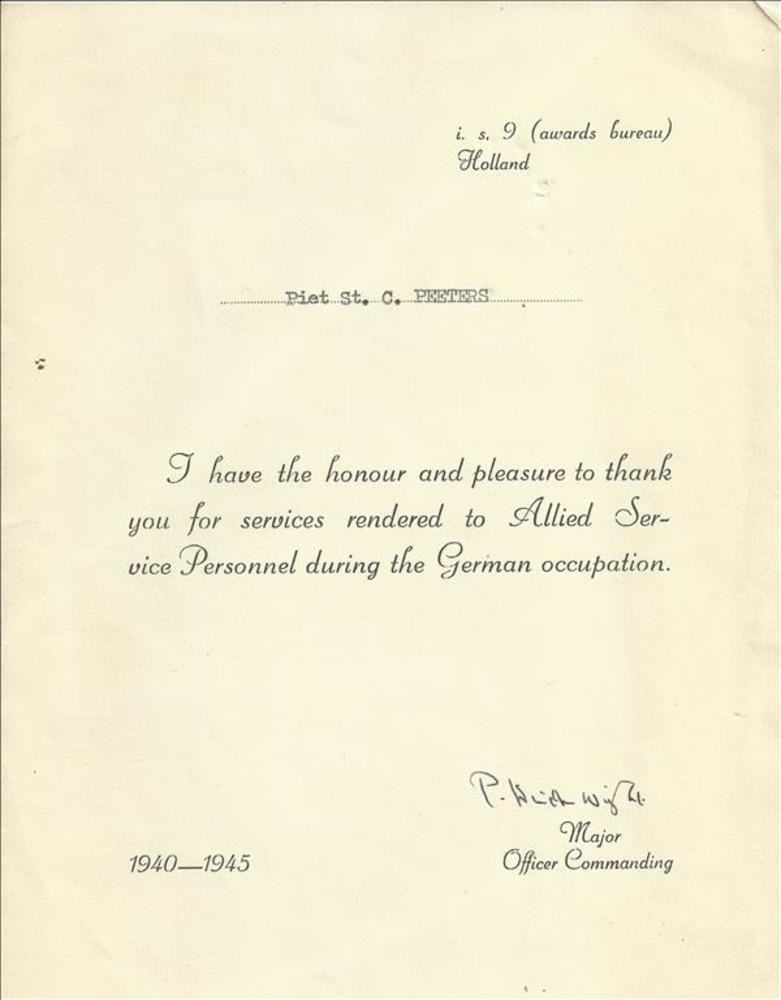 Dankbetuiging van Ii.S.9 (Awards Bureau) Holland aan...