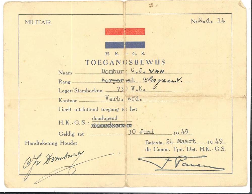 Militair Toegangsbewijs C.J. van Domburg, 30 juni 1949