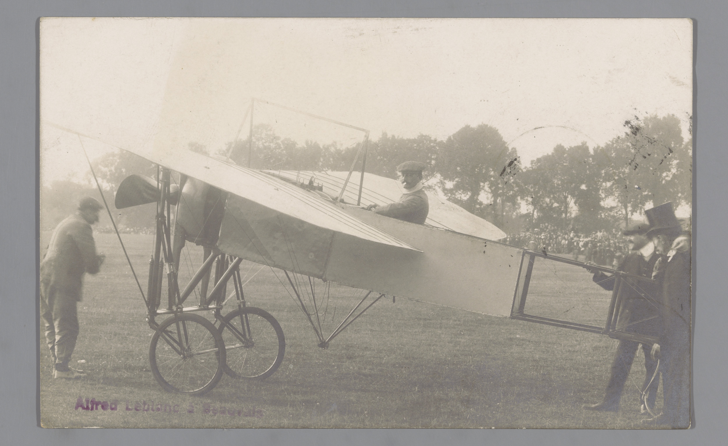 Portret van Louis Blériot op zijn vliegtuig