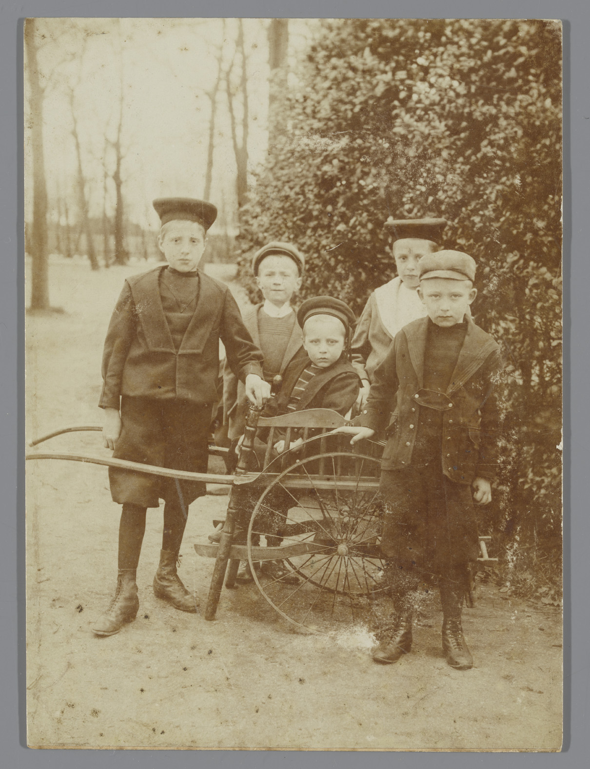 Groepsportret van vijf jongens rond een rolstoel
