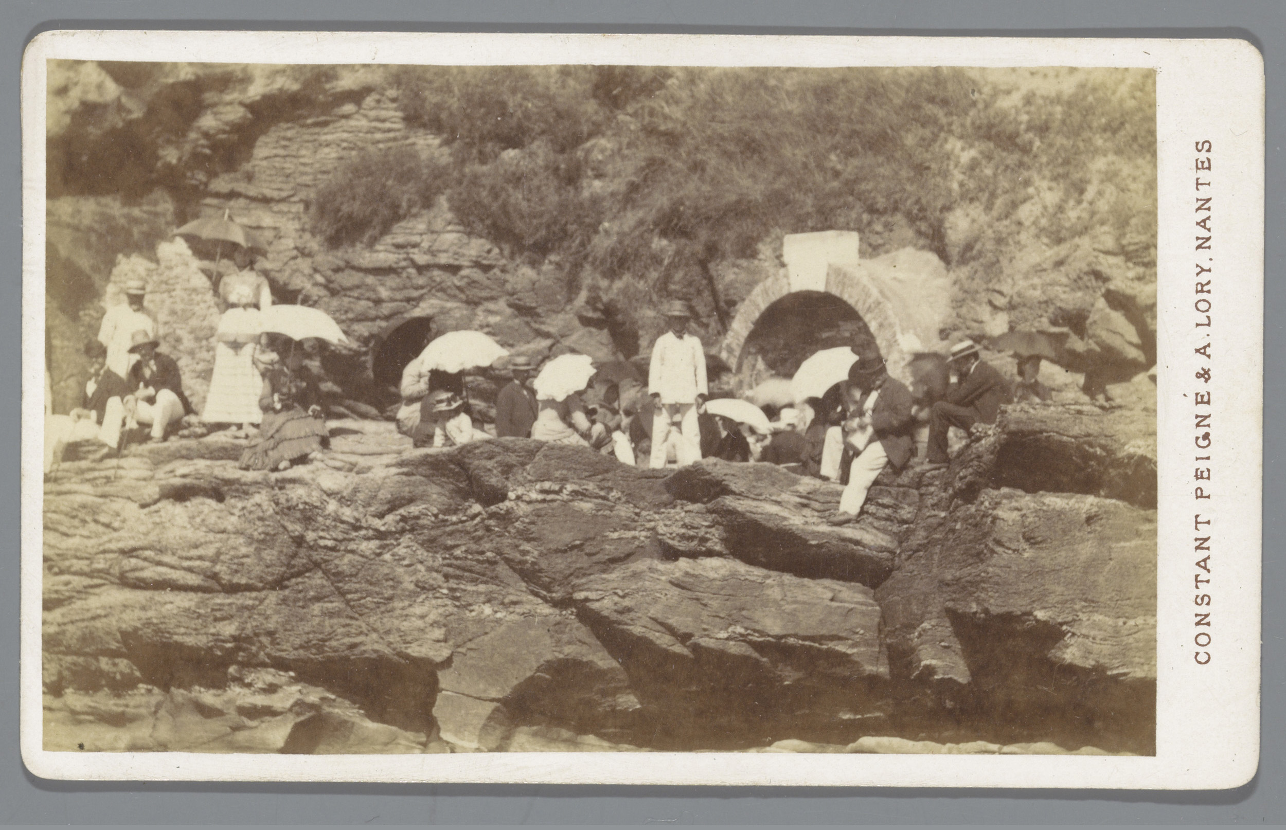 Groep mensen zittend op rotsen met parasols
