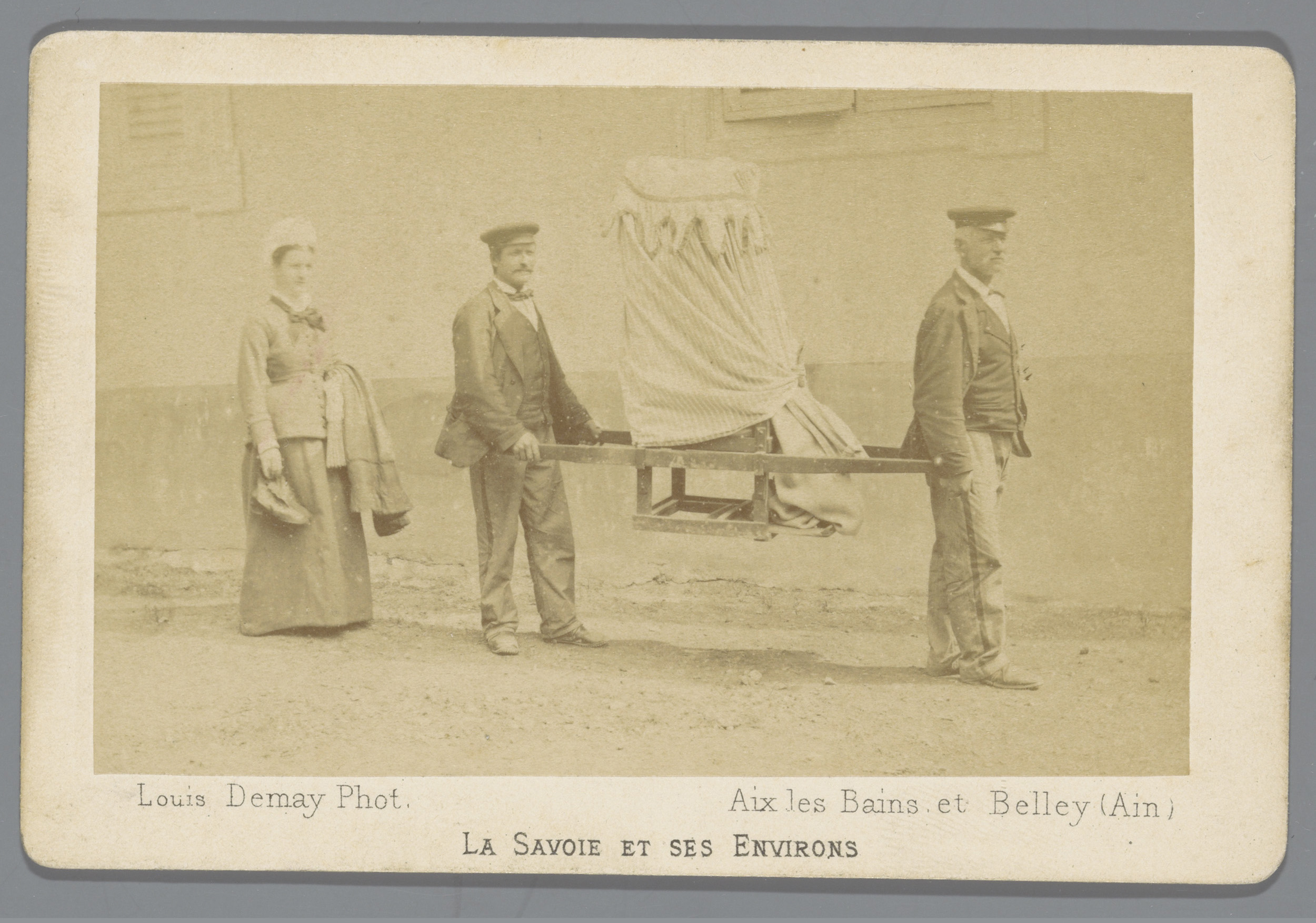 Twee mannen dragen een draagstoel en een vrouw loopt...
