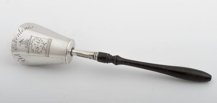 Zilveren suikerschep "Uit Erkentenis" met bruin hout...