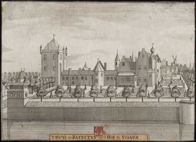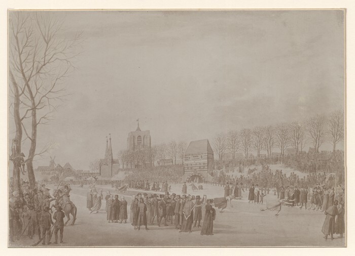 Prent met schaatsende mensen, op achtergrond de Olde...