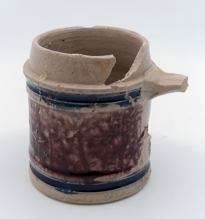 Steengoed beker met oor, cilindrisch, paars gevlekt