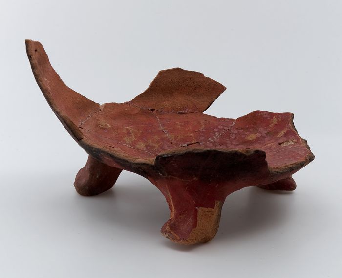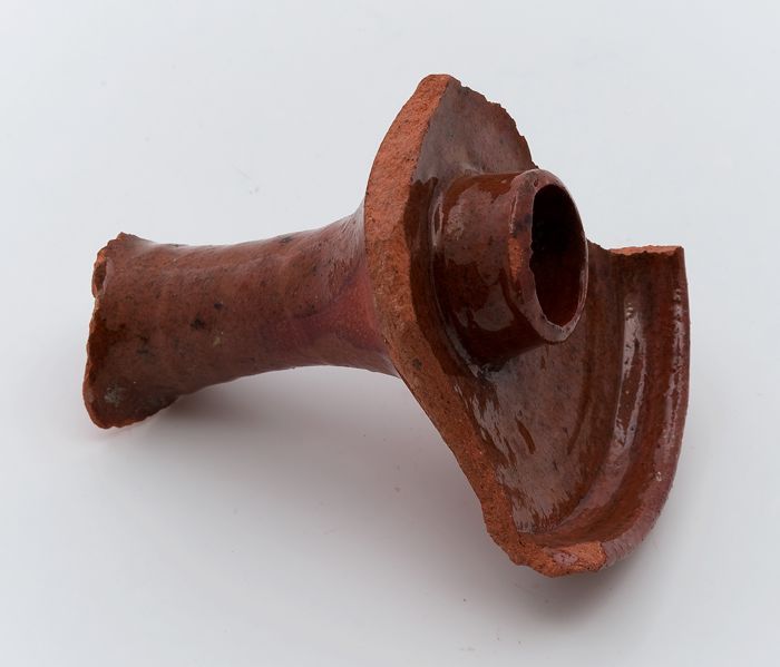 Fragment kaarsenstandaard van rood aardewerk, opstaa...