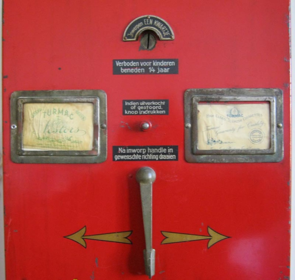 Sigarettenautomaat van ijzer en glazen venstertjes v...