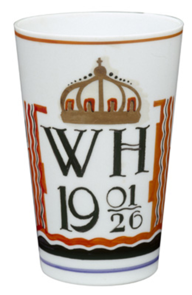 herinneringsbeker van melkglas met initialen W H, 1926