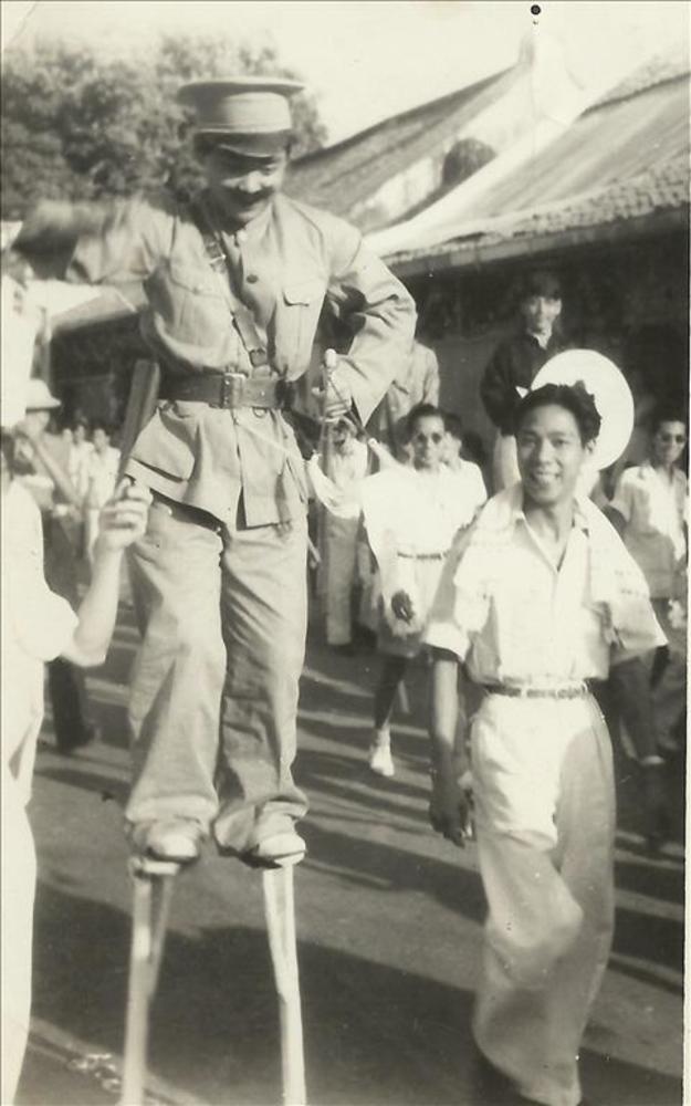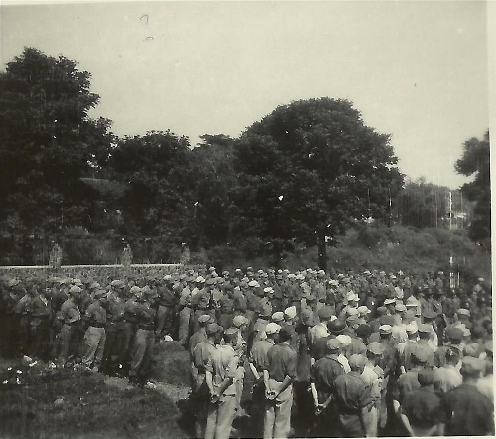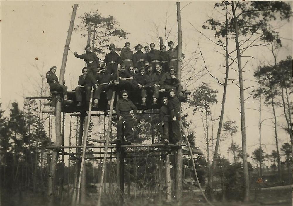 Indië na WO 2; groep militairen, houten stellage