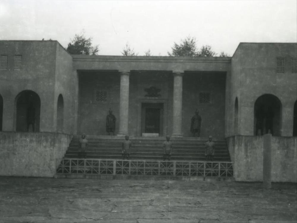 Nederlands Indië; zes militairen, gebouw, Saksen Wei...