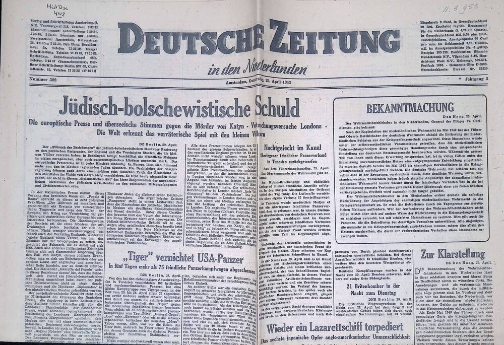 Deutsche Zeitung in den Niederlanden. 29 april 1943.